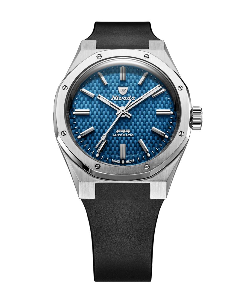 F77 Blue nabízí propracovaný číselník s košíkovou strukturou v sytém modrém odstínu, doplněný o výrazný sunray efekt, který si během dne pohrává se světlem. Detailní textura dodává hloubku, zatímco aplikované stříbrné indexy a batonové ručky podtrhují jeho vintage charakter. Spojuje současnou eleganci s duchem původního modelu z roku 1977 a představuje tak všestrannou volbu pro každou příležitost.