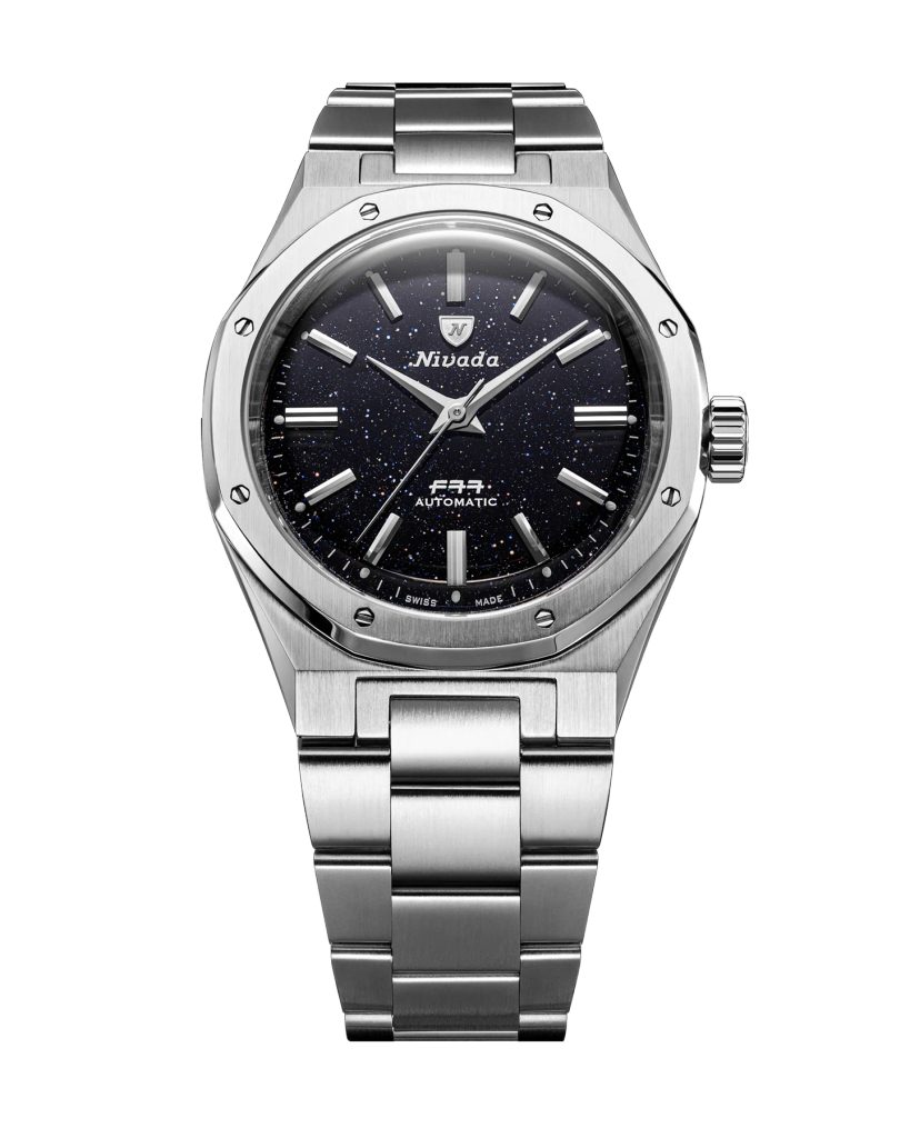 F77 MKII Blue Aventurine odráží světlo jako noční obloha. Jeho třpytivý povrch tvoří jemné jiskřivé inkluze, které vytvářejí hloubku a jas při proměnlivém světle. Čistá geometrie pouzdra F77 podtrhuje kosmický charakter číselníku a zároveň zachovává proporce sportovně-luxusního stylu. O pohon se stará švýcarský automatický strojek SOPROD P024 s rezervou chodu 38 hodin. Elegantní. Nenápadné. Výrazné.