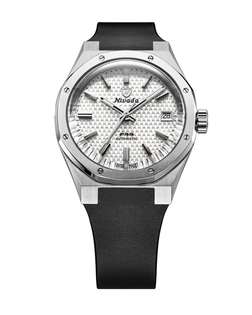 F77 White nabízí propracovaný číselník s košíkovou strukturou v sytém modrém odstínu, doplněný o výrazný sunray efekt, který si během dne pohrává se světlem. Detailní textura dodává hloubku, zatímco aplikované stříbrné indexy a batonové ručky podtrhují jeho vintage charakter. Spojuje současnou eleganci s duchem původního modelu z roku 1977 a představuje tak všestrannou volbu pro každou příležitost.