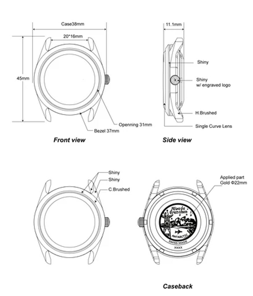 Super Antarctic má středně velké pouzdro o průměru 38 mm a tloušťce 12 mm, vyrobené z nerezové oceli 316 s leštěnou a kartáčovanou povrchovou úpravou. Uvnitř hodinek pracuje automatický strojek SOPROD P024. Model disponuje voděodolností 10 ATM.