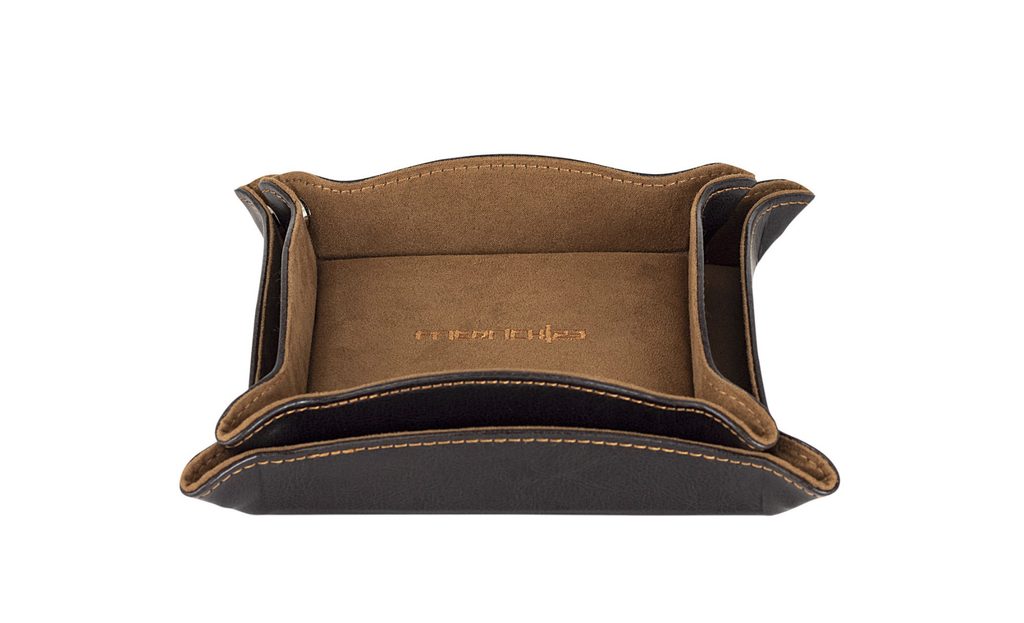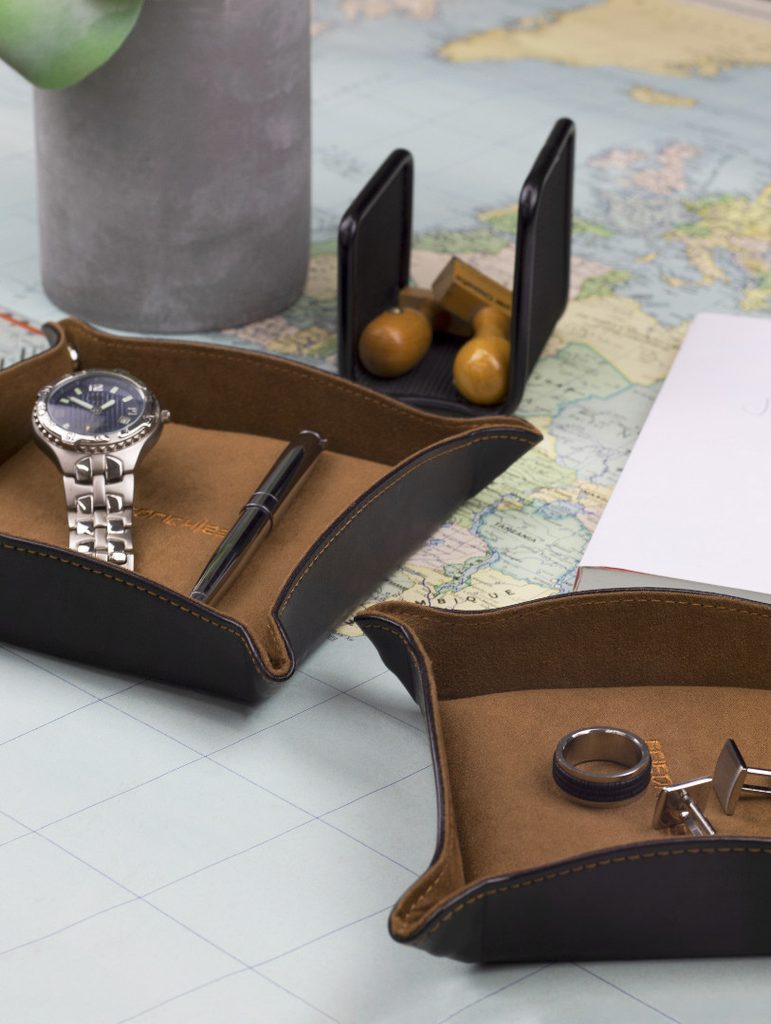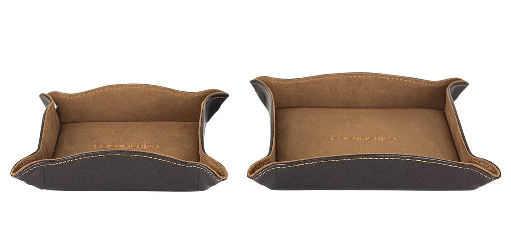 Sada dvou praktických odkládacích platíček Friedrich Lederwaren 20119-3, vyrobených ze syntetické kůže hnědé barvy. Platíčka mohou být i rozložena díky rozepnutým rohovým cvočkům a skvěle se hodí k odložení hodinek, manžetových knoflíků, prstenů a dalšího příslušenství. Díky svým kompaktním rozměrům se dají přibalit do batožiny na dovolenou nebo pracovní cestu.