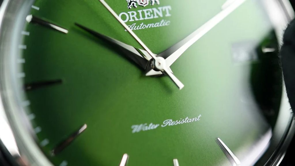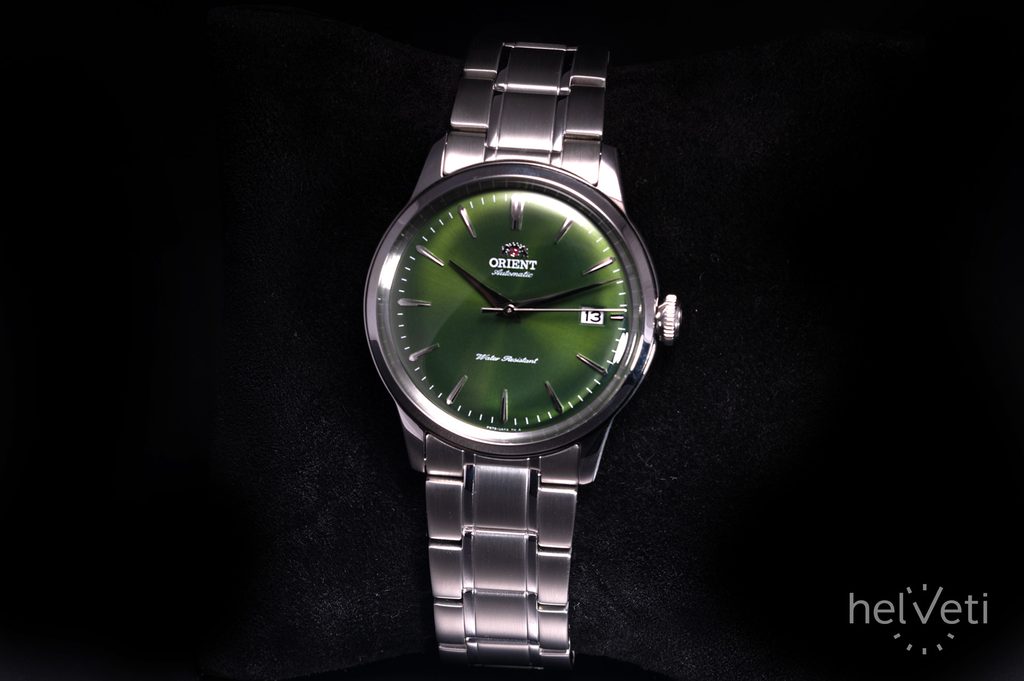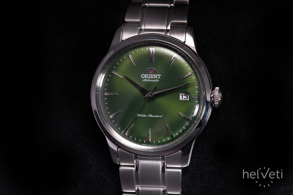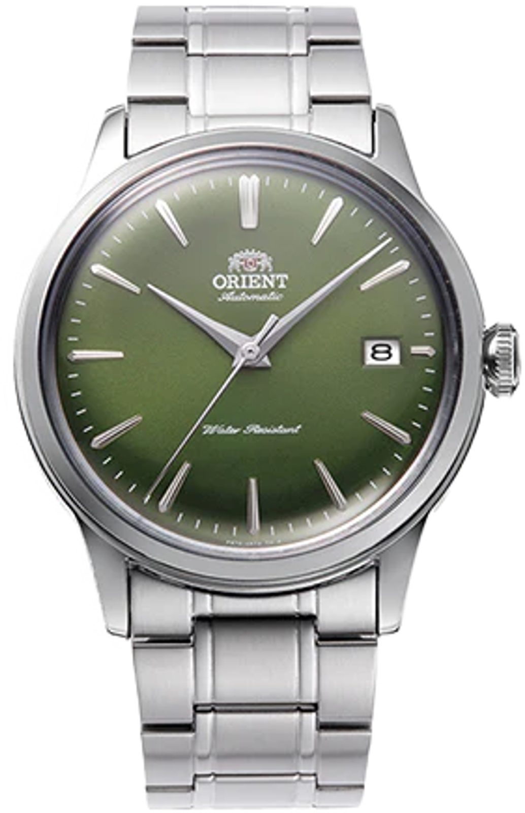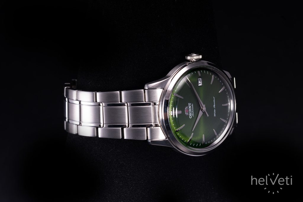 Charakteristickými znaky hodinek Orient Bambino jsou klenuté sklíčko, zakřivený číselník a celkově jednoduché linie a klasický vzhled. Číselník osvěžující zelené barvy oceníte pro dobrou přehlednost, chráněn je minerálním sklem. Číselník potěší detaily v podobě plastických indexů na hodinových pozicích, či dauphine ruček. Hodinky jsou vybavené ukazatelem data na pozici 3. hodiny. Voděodolnost tohoto modelu je 30 m, hodinky tak snesou kontakt s vodou při mytí rukou a dešti. Ocelové pouzdro doplňuje klasický třířadý ocelový náramek zakončený překlápěcí sponou. Hodinky budou skvěle vypadat také na koženém řemínku. Díky průměru pouzdra 38,4 mm jsou hodinky skvělou volbou k obleku a budou vyhovovat také menším zápěstím.