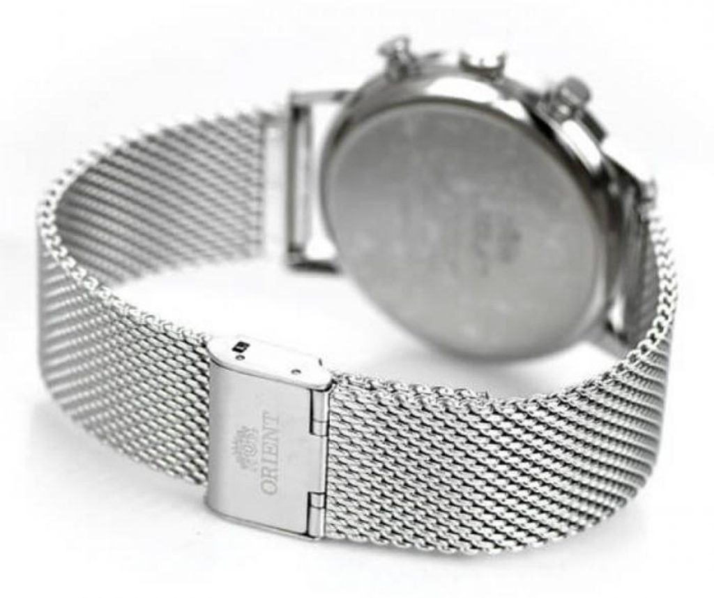 Pouzdro hodinek Orient RA-KV0401L10B je vyrobeno z ušlechtilé oceli a v jeho nitru najdeme japonský bateriový strojek Orient VR322. Ten disponuje funkcí stopek, jejichž hodnoty lze odečítat na subcifernících na pozici 6. (vteřiny) a 9. (minuty) hodiny, 24hodinovým ukazatelem času v subciferníku u třetí hodiny, či ukazatelem data na pozici půl páté. Číselníku, zpracovaném ve stylu Bauhaus, vévodí minimalismus, který hodinkám nijak neubírá na skvělé čitelnosti.