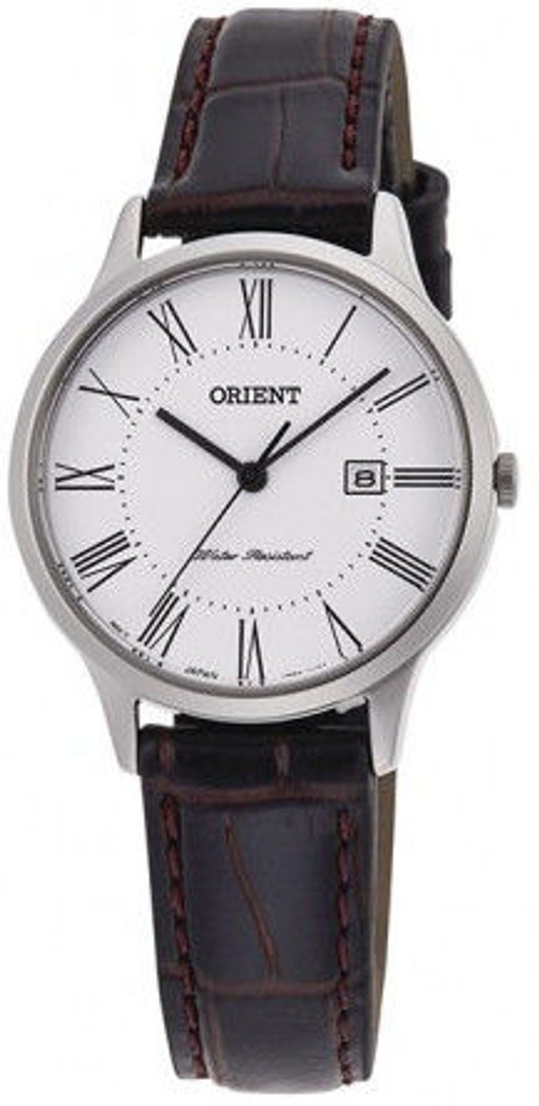 Náramkové hodinky Orient RF-QA0008S10B nabízí jednoduchý, přehledný design, díky kterému jsou ozdobou každého dámského zápěstí. Ocelové pouzdro hodinek doplňuje hnědý řemínek s krokodýlím vzorem. Hodinky pohání kvalitní bateriový strojek Orient VL321. Elegantní číselník je doplněn jemnými, avšak přehlednými obuškovými ručkami. Ucelený vzhled číselníku neruší ani ukazatel data se světlým pozadím a tmavými číslicemi. Chrání ho minerální sklíčko. Voděodolnost modelu je 30 m, vhodné na kontakt s vodou při dešti, mytí rukou. Průměr pouzdra je na klasické hodinky ideálních 30 mm.