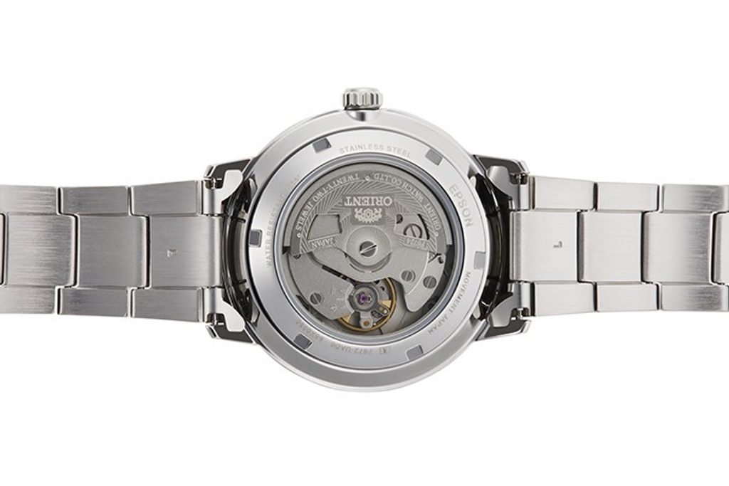 Pouzdro hodinek Orient RA-AC0E02S30B je vyrobeno z ušlechtilé oceli a v jeho nitru najdeme mechanický strojek Orient F6722, který je opatřen automatickým nátahem a rezervou chodu 40 hodin. Tento strojek disponuje také funkcí data, možností ručního nátahu a zastavením sekundové ručky při nařizování hodinek (tzv. hackingem). Činnost strojku, pracujícího na frekvenci 21600 polokmitů/hod. lze pozorovat díky průhlednému dýnku.