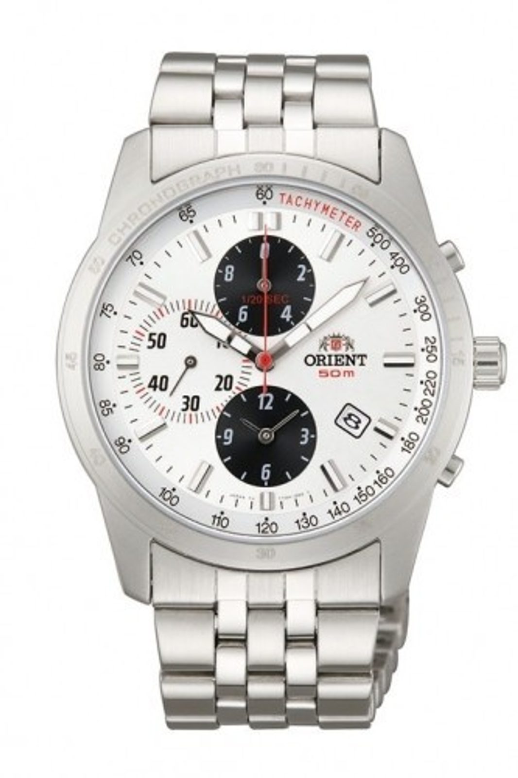 Hodinky Orient TT0H002W disponují japonským bateriovým strojkem s funkcí chronografu, tedy stopek. Na pozici 4 pak nejdeme ukazatel data, zajímavá je funkce tachymetru. Přehledný bílý číselník je chráněn minerálním sklíčkem. Pouzdro hodinek je vyrobeno z ušlechtilé oceli a výborně ladí s dodávaným ocelovým náramkem. Vodotěsnost tohoto modelu je 50m, hodinky tak zvládnou sprchu či silnější déšť. Průměr pouzdra je 40 mm, jedná se tedy o průměrně velké hodinky, padnoucí na většinu pánských zápěstí.