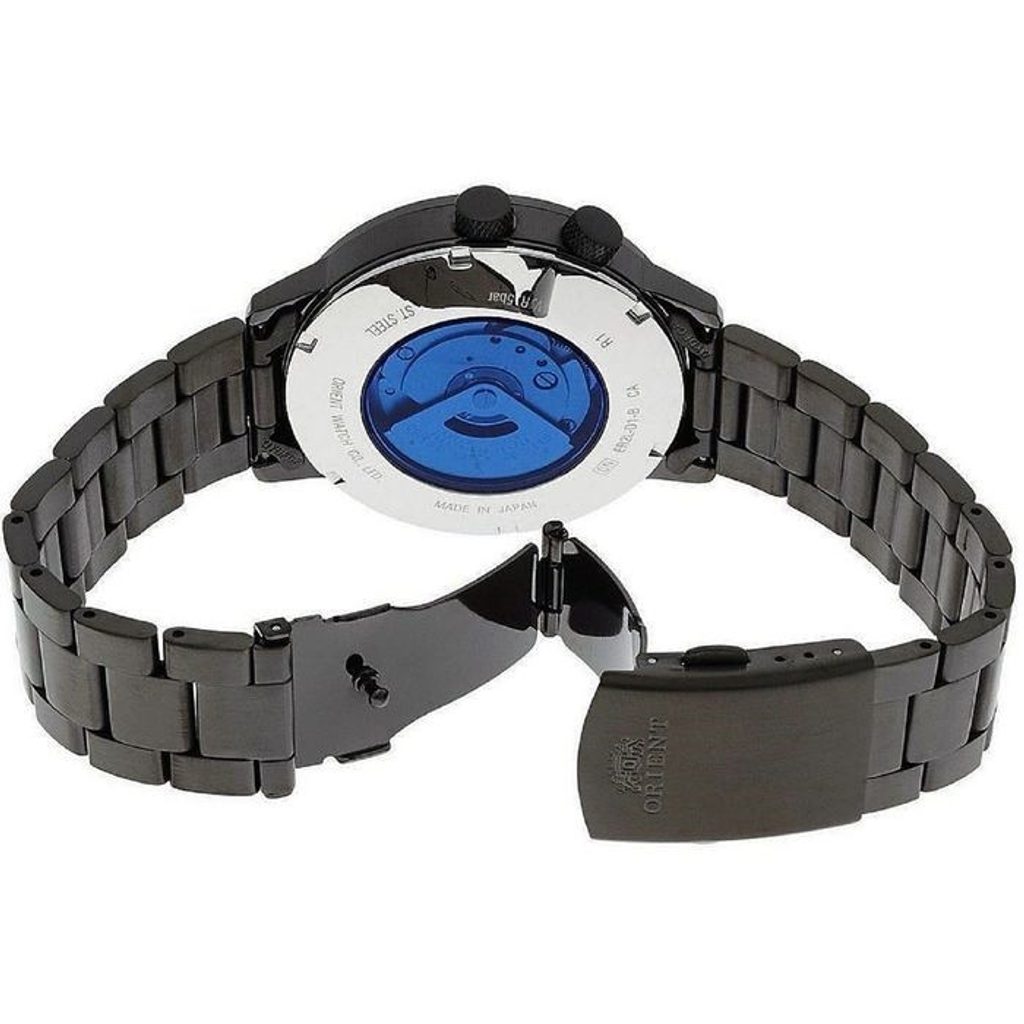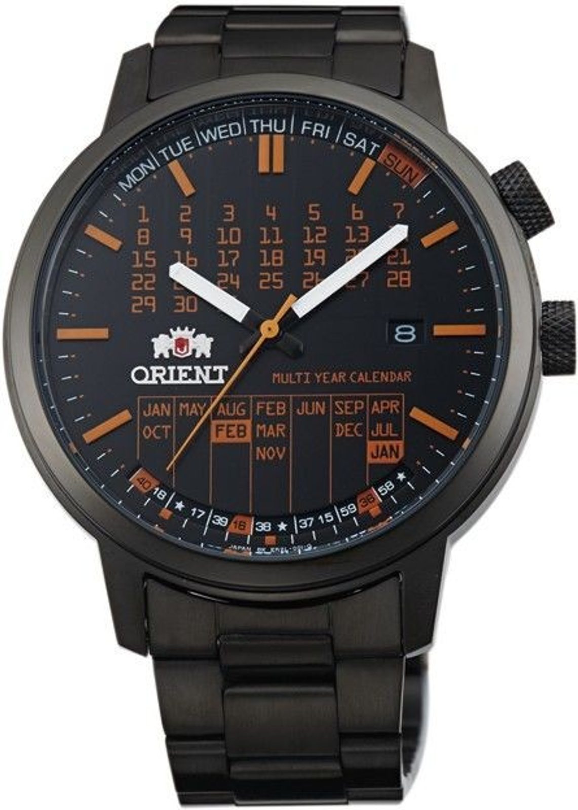 Ciferník, kterému dominuje hlavně výše zmíněný víceletý kalendář, je chráněn minerálním sklem. Voděodolnost tohoto modelu je 50 m, kontakt s vodou jako sprcha či déšť pro něj tedy není problém. Hodinky Orient FER2L001B jsou dodávány se stylovým ocelovým náramkem s PVD úpravou, který vhodně ladí k designu pouzdra. Průměr pouzdra 42,5 mm je řadí mezi průměrně velké hodinky, padnou tedy výborně na většinu pánských zápěstí.