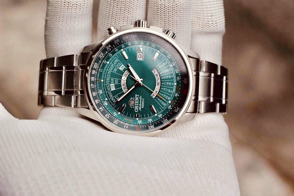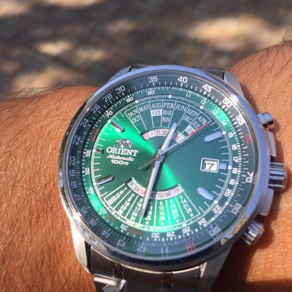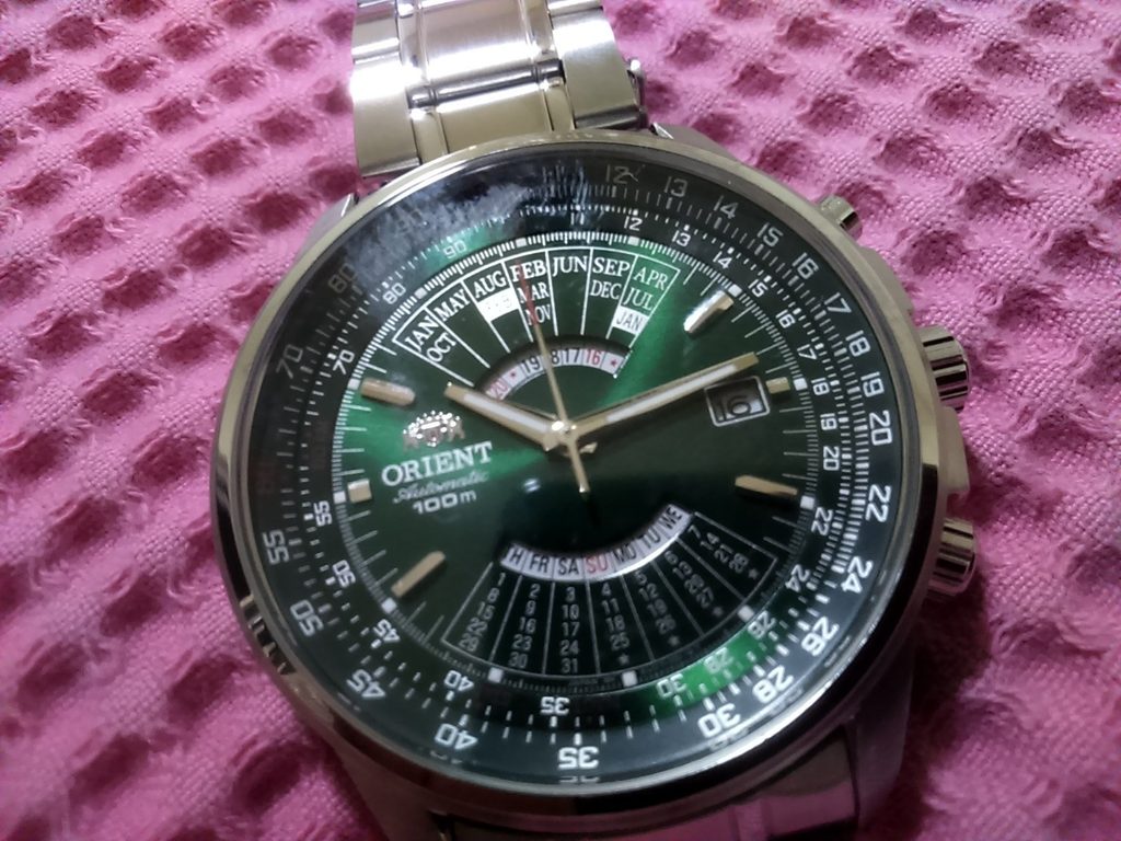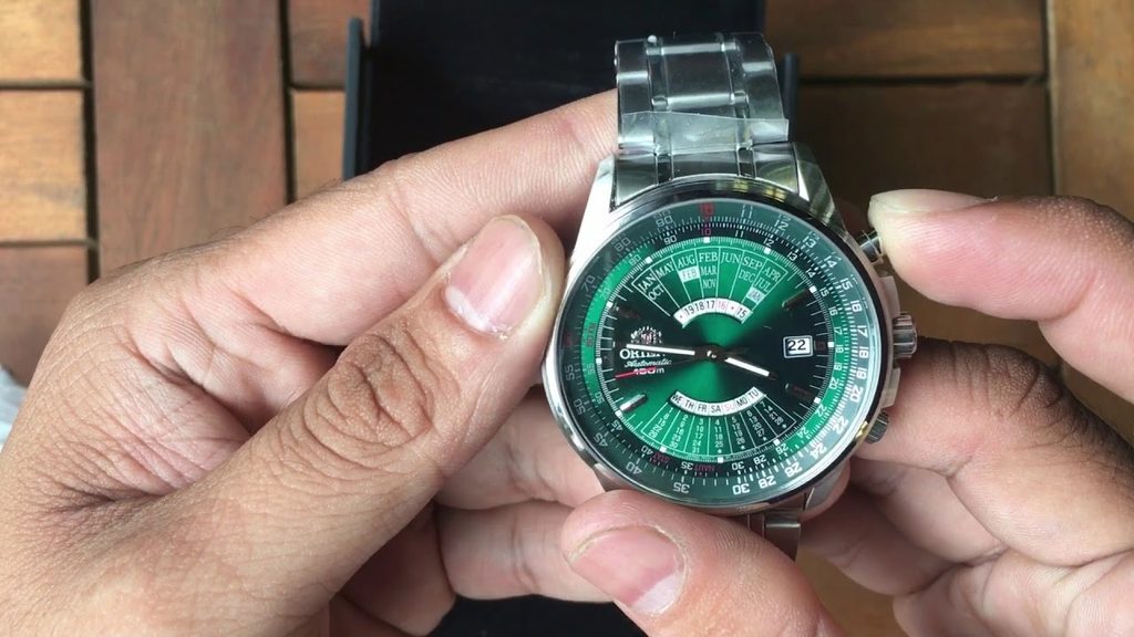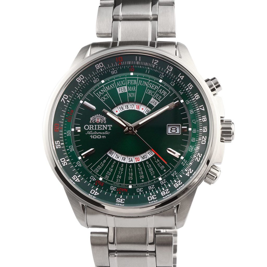 Po obvodu číselníku pak najdeme logaritmické pravítko, nastavitelné korunkou na pozici 4. Ciferník, kterému dominuje hlavně výše zmíněný víceletý kalendář, je chráněn minerálním sklem. Voděodolnost tohoto modelu je 100 m, sprcha či plavání pro něj tedy není problém. Hodinky Orient FEU07007F jsou dodávány se stylovým ocelovým náramkem, který vhodně ladí k designu pouzdra. Průměr pouzdra 43 mm je řadí mezi průměrně velké hodinky.