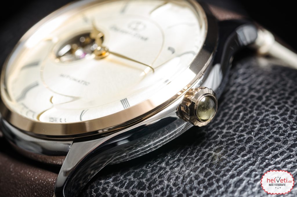Jednoduchý, nadčasový, výborně přehledný číselník v odstínu šampaň je chráněn mírně klenutým minerálním sklem. Hodinky potěší svými detaily, mezi něž patří jemné zlaté ručky, tvarově zajímavá signovaná korunka s kabošonem, římské číslice na hodinových pozicích, efekt klenutého sklíčka. Hodinkám nechybí celková jemnost detailů a výjimečná kvalita zpracování. Elegantnost hodinek umocňuje dodávaný kožený řemínek zakončený překlápěcí sponou. Voděodolnost tohoto modelu je 50 m, hodinky tedy bez problému odolají běžnému kontaktu s vodou, jako je déšť, výjimečně sprcha. Díky svému specifickému vzhledu a průměru pouzdra 30,5 mm jsou skvělou volbou při výběru elegantních dámských hodinek.