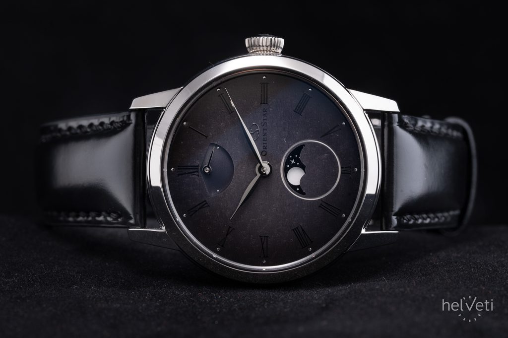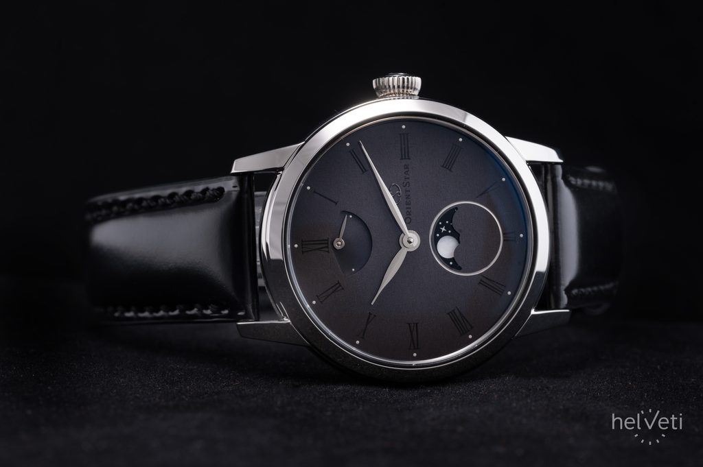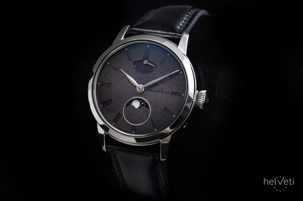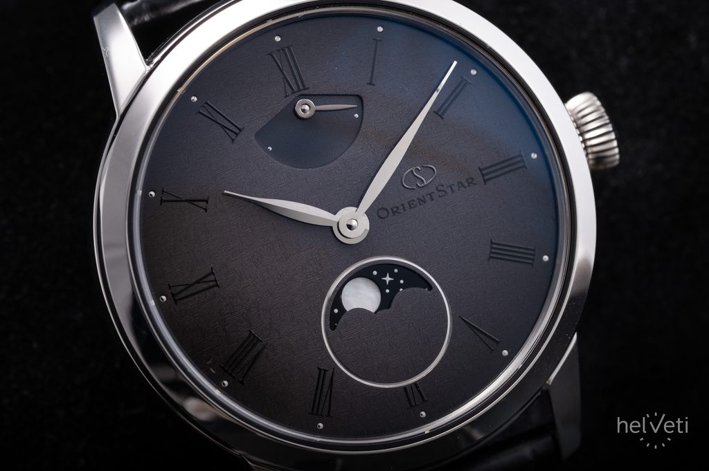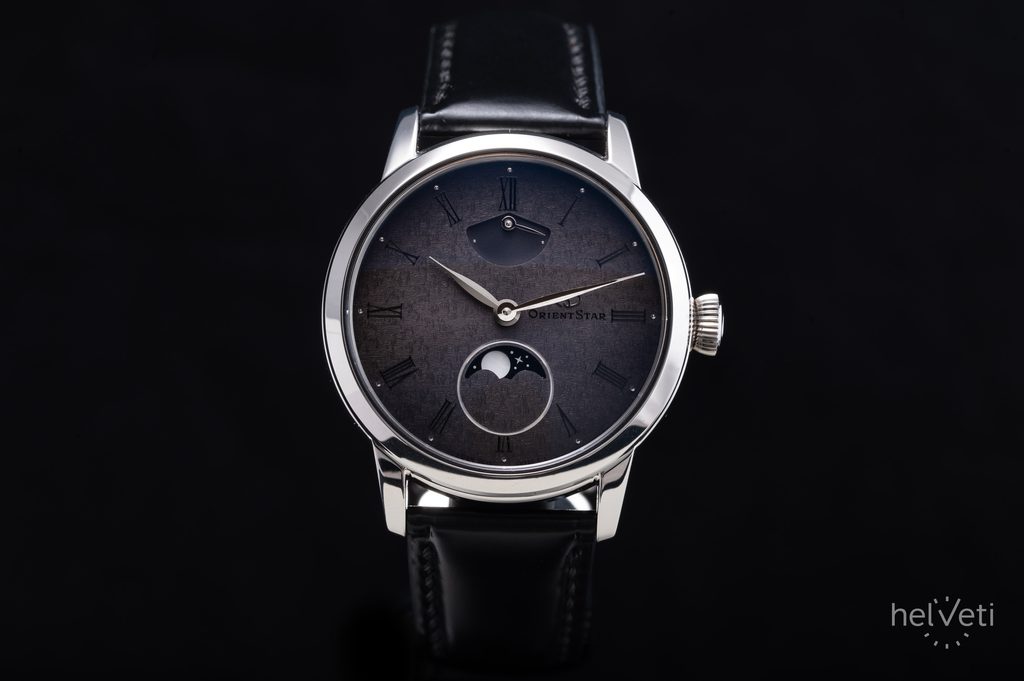 Vybrané číselníky Orient Star jsou charakteristické složitými výrobními procesy a pokročilá technologie. U tohoto modelu jsou na povrch číselníku nejdříve vyraženy vzory, které představují hvězdy. Jemné vzory mění podobu v závislosti na úhlu, ze kterého na plochu dopadá světlo a vytváří scénu třpytivých hvězd. Poté je na povrch nanese barva, jejíž hustota se jemně upravuje, aby bylo dosaženo přechodu z šedé ve středu číselníku po černou, která se objevuje směrem k vnějšímu okraji. Lakovaný povrch je navíc potažen médiem, které dodává šedému číselníku hloubku noční oblohy a vesmíru.