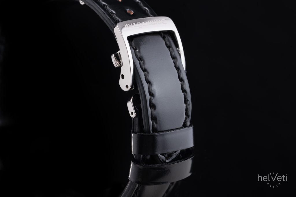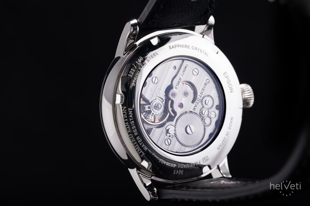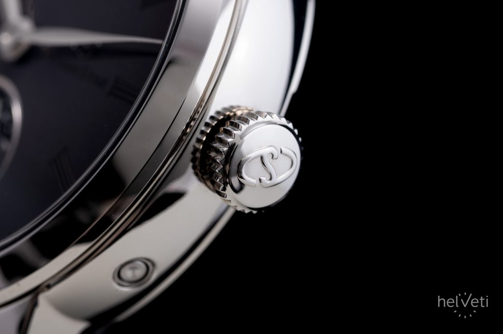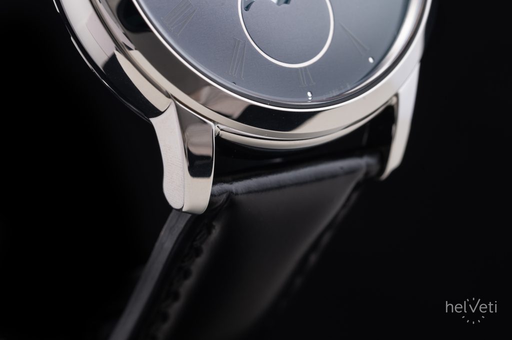 Nevšední číselník je chráněn safírovým sklem s antireflexní vrstvou, zajišťující lepší čitelnost i na přímém světle. Voděodolnost tohoto modelu je 30 m, hodinky tedy bez problému odolají běžnému kontaktu s vodou, jako je déšť a mytí rukou. Elegantnost hodinek umocňuje dodávaný černý kožený cordovan řemínek zakončený překlápěcí sponou. Tento luxusní přírodní materiál je známý svou vysokou odolností, jemným leskem a dlouhou životností. Díky průměru pouzdra 39,5 mm jsou hodinky skvělou volbou k obleku.