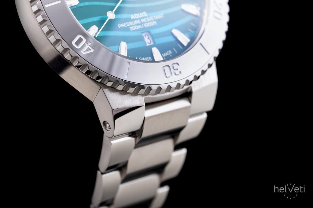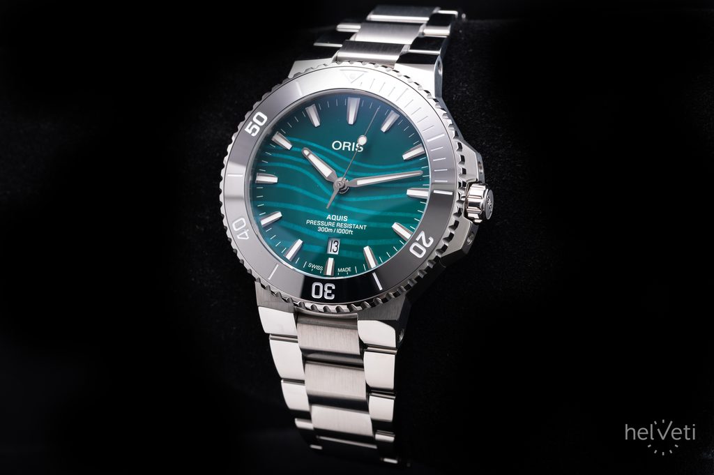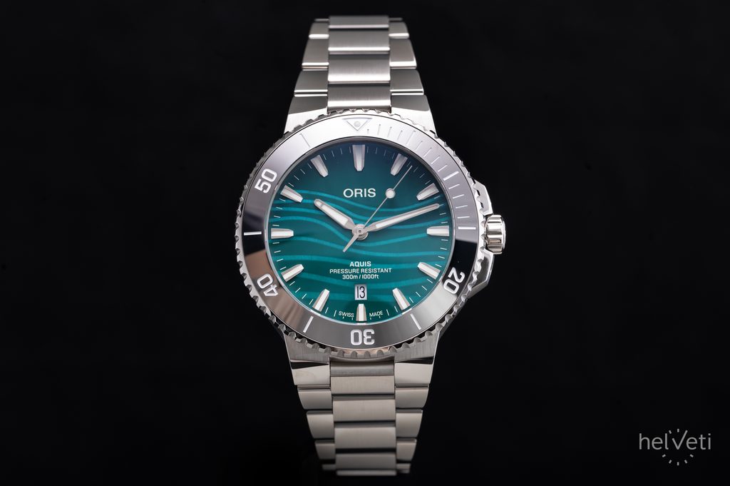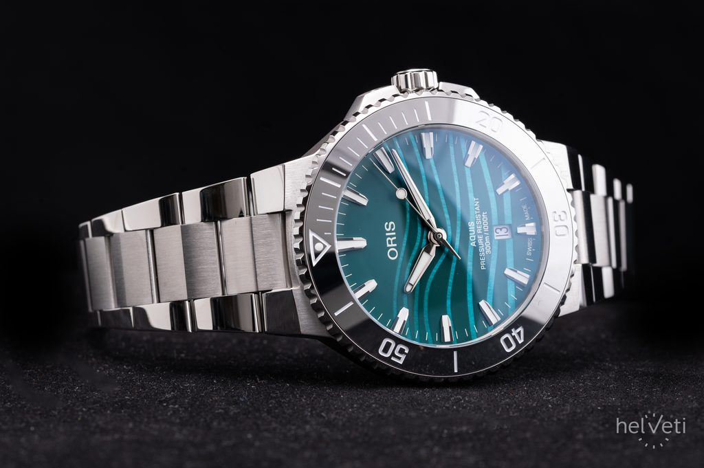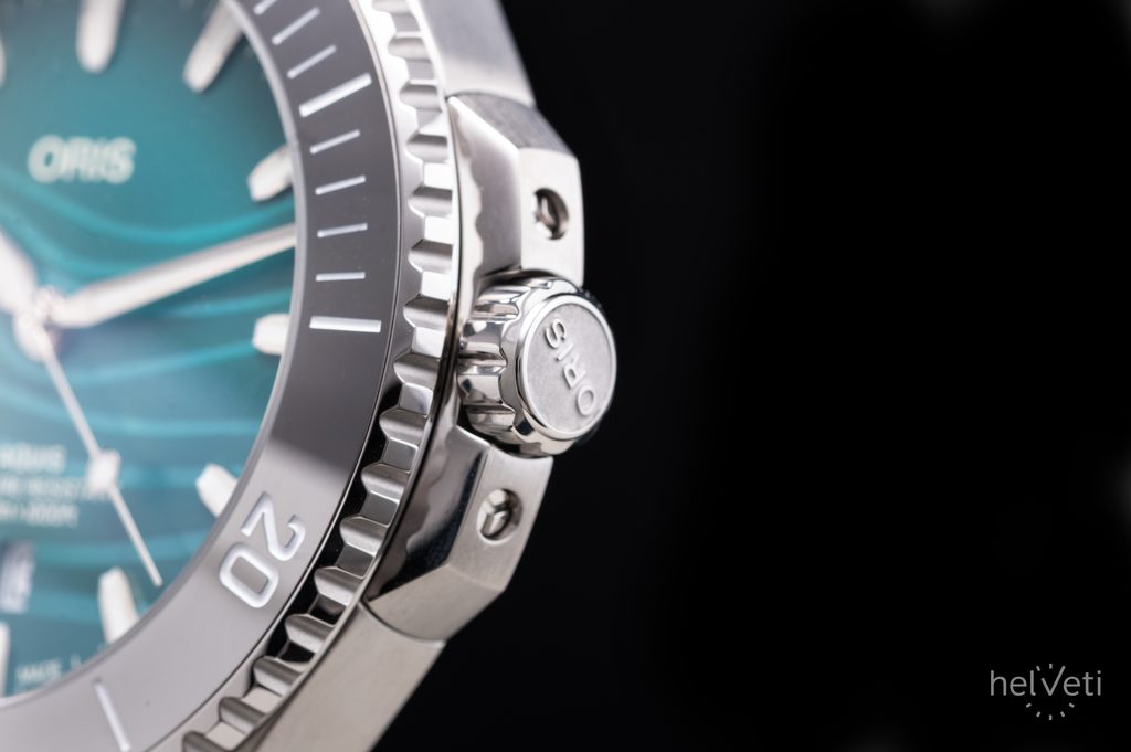 Pouzdro hodinek Oris Aquis Date 43,5 mm Yangtze Jiangtun Limited Edition 0173377894197-Set je vyrobeno z ušlechtilé oceli, stejně jako jejich náramek. Uvnitř jeho nitra spolehlivě pracuje švýcarský mechanický strojek Oris 733 (základem je Sellita SW200-1) s automatickým nátahem. Tento strojek má v sobě 26 kamenných uložení a pracuje na frekvenci 28800 polokmitů za hodinu (4 Hz). Na pozici 6 se nachází praktický ukazatel data. K měření časových úseků poslouží jednosměrně otočná keramická potápěčská luneta.