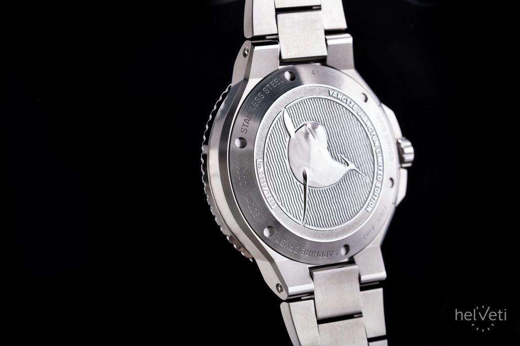 Dokonale přehledný číselník je chráněn klenutým safírovým sklíčkem, které je maximálně odolné vůči poškrábání. Číselník je vyroben z modrozelené perleti, materiálu vybraného pro jeho schopnost zachycovat a odrážet světlo podobně jako hladina řeky Jang-c'- ťiang. Číselník je navíc opatřen vzorem, inspirovaným ozvěnou vysokofrekvenčních, úzkopásmových ultrazvukových vln, které sviňucha bezploutvá využívá ke komunikaci a navigaci v kalných vodách řeky. Čitelnost za ostrého světla pak zajišťuje vnitřní antireflexní vrstva. Ve tmě a snížených světelných podmínkách pak poslouží luminiscence Superluminova na ručkách a indexech. Voděodolnost těchto hodinek je 300 m (30 ATM), zvládnou tedy i kontakt s vodou, jako je potápění do cca 30 metrů. Odolnost proti vodě je podpořena šroubovací korunkou.