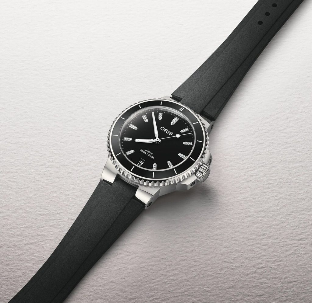 Švýcarské hodinky Oris Aquis Date Diamonds 01 733 7792 4194-07 4 19 64FC zaujmou svým specifickým, vysoce atraktivním "potápkovým" provedením a excelentním zpracováním. Tento model výborně poslouží nejen pod vodou, ale i při každodenním nošení. Použití diamantů pak dělá z tohoto kusu také atraktivní šperk pro společenské události.