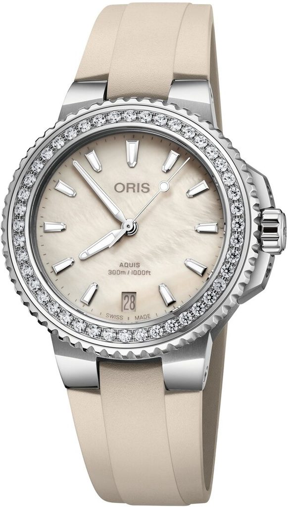 Švýcarské hodinky Oris Aquis Date Diamonds 01 733 7792 4956-07 4 19 61FC zaujmou svým specifickým, vysoce atraktivním "potápkovým" provedením a excelentním zpracováním. Tento model výborně poslouží nejen pod vodou, ale i při každodenním nošení. Použití diamantů pak dělá z tohoto kusu také atraktivní šperk pro společenské události.