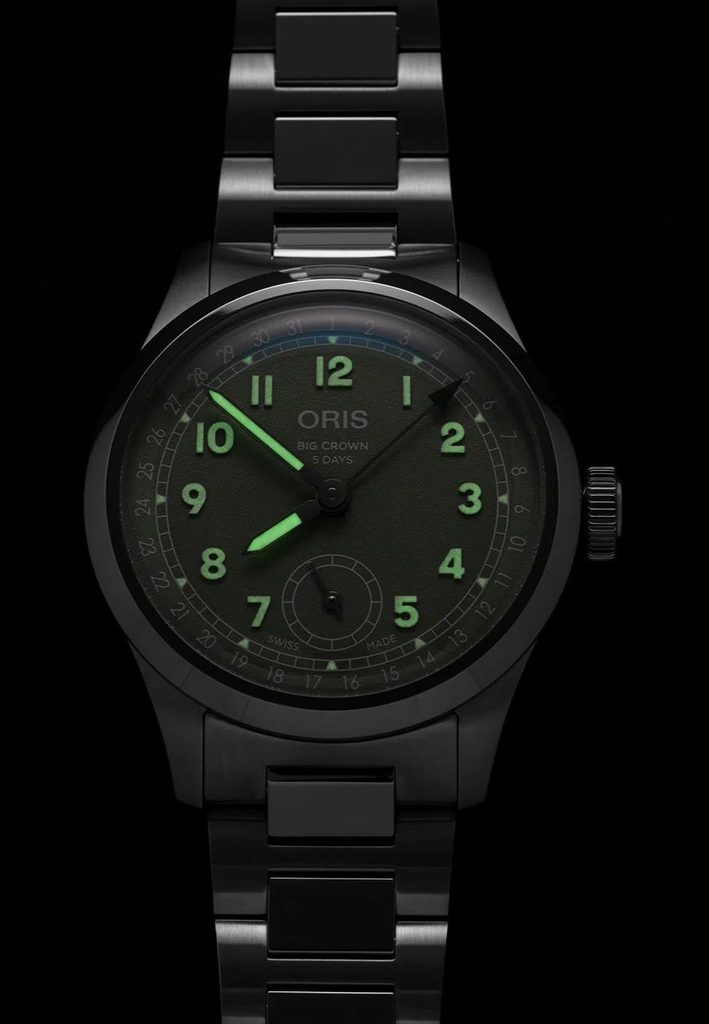 Dokonale přehledný číselník, vyvedený v retro pilotním stylu, je chráněn klenutým safírovým sklíčkem, které je maximálně odolné vůči poškrábání. Čitelnost za ostrého světla pak zajišťuje vnitřní antireflexní vrstva. Ve tmě a snížených světelných podmínkách pak poslouží luminiscence Superluminova na ručkách a indexech. Voděodolnost těchto hodinek je 50 m (5 ATM), zvládnou tedy i kontakt s vodou, jako je sprcha či déšť.