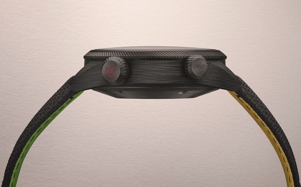 Pouzdro hodinek Oris ProPilot Altimeter x Bamford Mission Control Limited Edition 01 793 7775 8724-Set je vyrobeno z unikátního karbonu a je doplněno řemínkem v kombinaci textil-kůže. Lunetu zdobí typické vroubkování, které symbolizuje turbínu letadlového motoru. Řemínek je opatřen speciální patentovanou sponou zvanou "Lift", která je stylově konstruována jako spona u bezpečnostního pásu v letadle. Luneta je vyrobena z titanu s černou PVD úpravou. Pouzdro bylo vyvinuto a vyrobeno ve spolupráci se společností 9T Labs se sídlem v Curychu. Ta se specializuje na návrh a vývoj výrobních řešení pro pevnější a lehčí díly pro letecký, kosmický a automobilový průmysl s důrazem na minimální dopady na životní prostředí. Oris byl první hodinářskou značkou, která spolupracuje s 9T Labs. Tento materiál pouzdra nenajdete na žádném jiném hodinkovém modelu. Karbon od společnosti 9T Labs poskytuje mimořádnou pevnost (větší než kov) při hmotnosti, jakou má plast. Hodinky i přes své větší rozměry váží pouhých 98 gramů.
