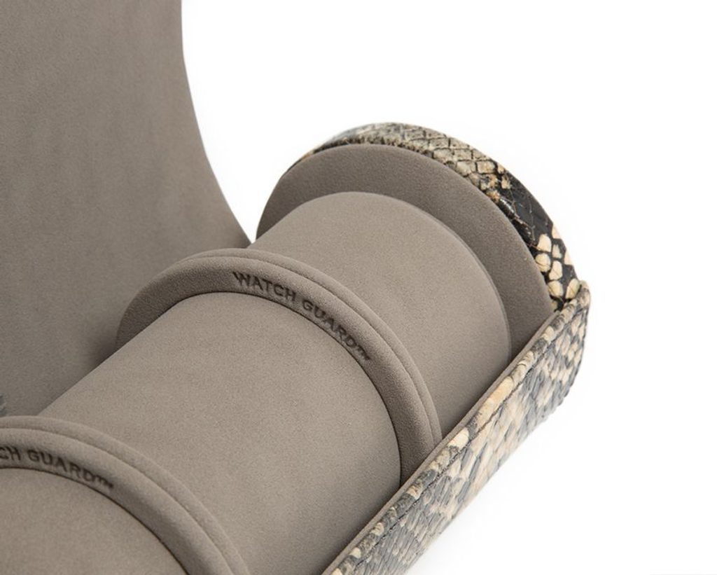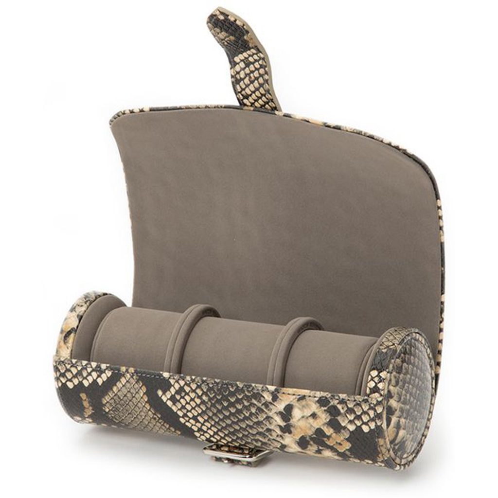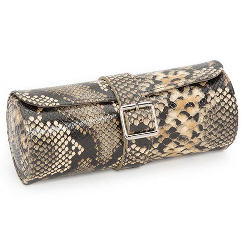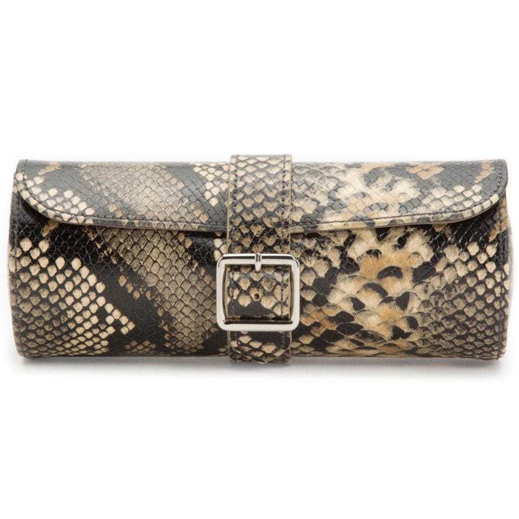 Wolf Exotic 462822 je velmi kvalitně zpracovaný watch roll ze strukturované kůže s chromovou přezkou. Uvnitř boxu jsou kroužky, které neumožní dotek jednotlivých hodinek. Tento watch roll je určen pro 3 kusy hodinek.