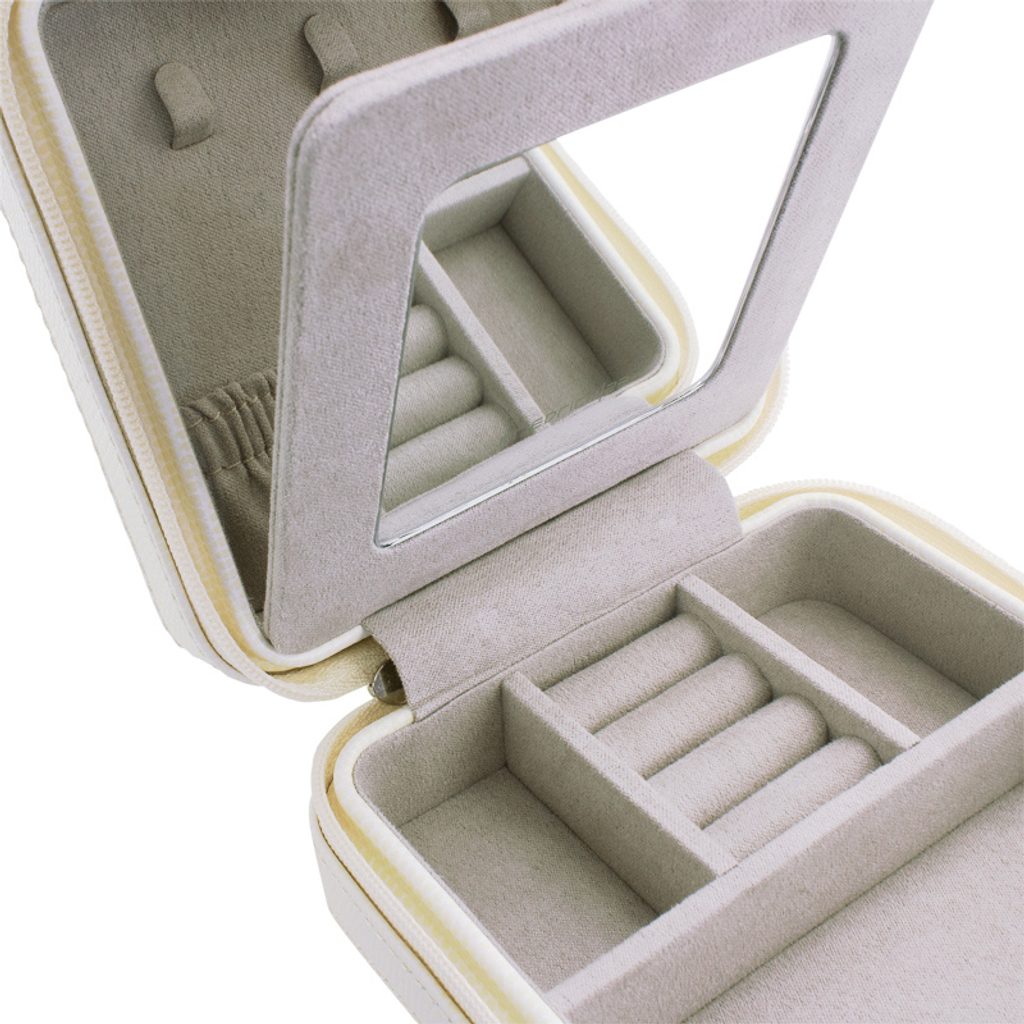 Obsahuje několik přihrádek pro uložení prstenů, náušnic, přívěsků, náramků a dalších cenností. Pouzdro obsahuje také vnitřní odklopné zrcátko, za kterým je další prostor pro uložení šperků.