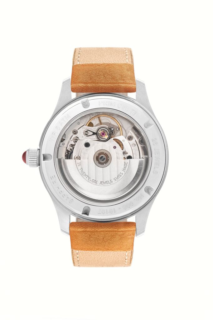 Prosklené zadní víko nabízí pohled na mechanický strojek.