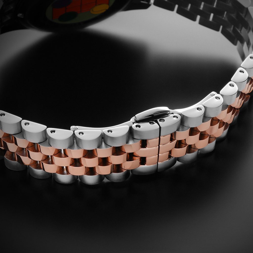 Pouzdro hodinek je vyrobeno z ušlechtilé oceli a hodinky drží na ruce díky kvalitně zpracovanému koženému ocelovému náramku s motýlovou sponou. Pouzdro i náramek jsou bicolor, tedy kombinace stříbrné barvy a rose gold.