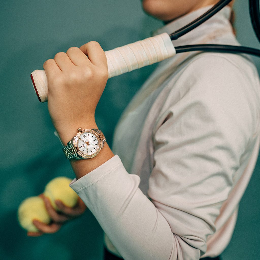 Elegantní sportovní model, inspirovaný tenisovou symbolikou, přichází na trh s výraznými černými indexy s 12 diamanty o velikosti 1,2 mm SI1. Číselník je vyroben z perleti, což mu dodává irizující, luxusní vzhled. Detailní zpracování, jako jsou aplikované indexy a precizní zasazení diamantů. Na pozici 3. hodiny najdeme praktický ukazatel data.