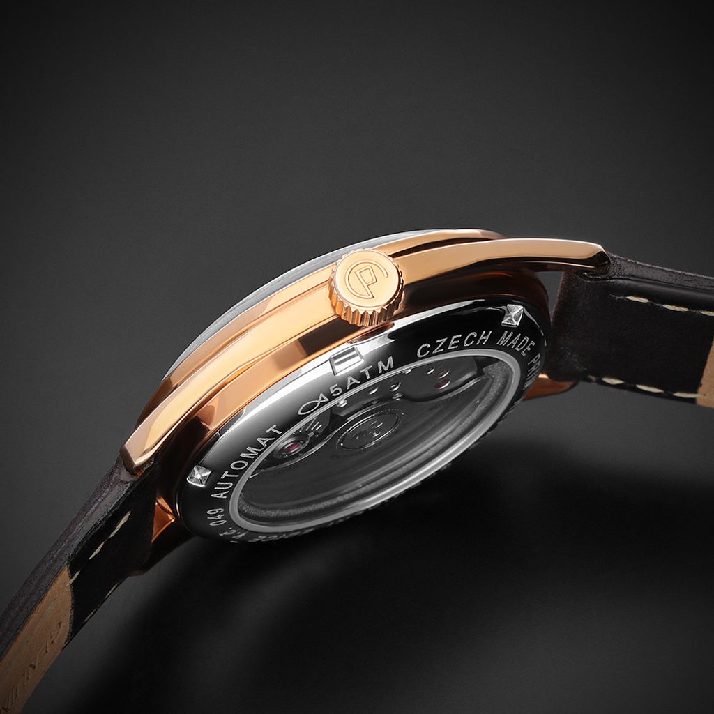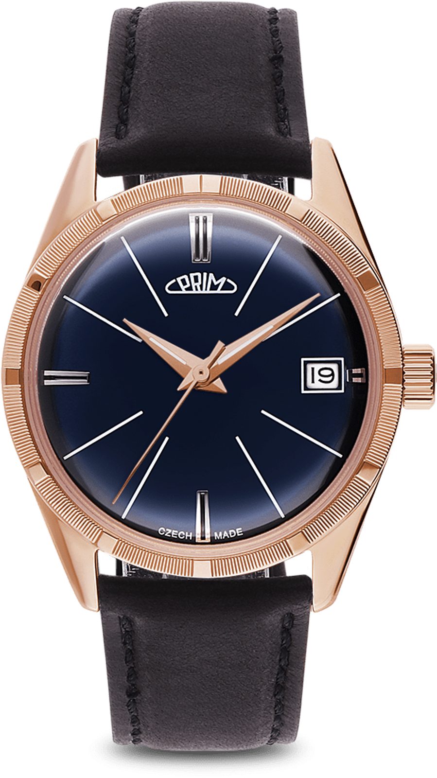 Pouzdro hodinek PRIM Lady Repre - D W02C.13164.D vyrobené z ušlechtilé oceli 316L s IPG povrchovou úpravou v barvě růžového zlata, má v případě dámského modelu průměr 34 mm. Originálem je zejména číselník v elegantním lakovaném provedení s tradičním motivem inspirovaným 60.léty stejně jako zdobení lunety jako tomu bylo zvykem u modelů vyráběných v minulosti. Lákavým prvkem jsou taktéž vystouplé indexy na pozicích 3, 6, 9 a 12.