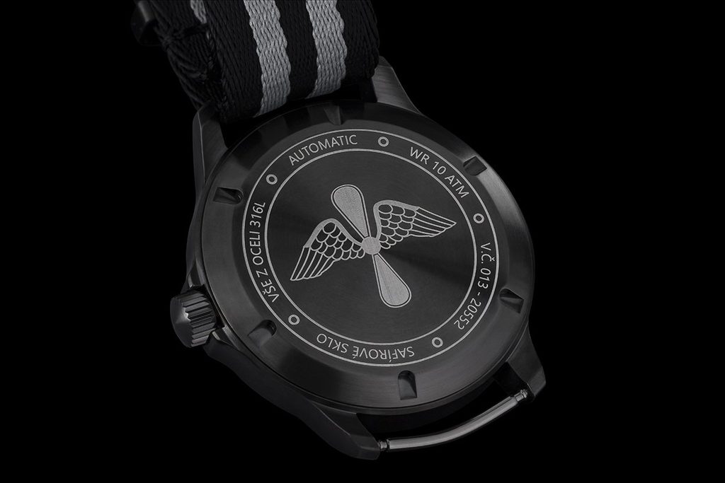 Dominantou plného zadního víka je dvoulistá okřídlená vrtule, odkazující na počátky československého civilního letectví – tento symbol zdobil knoflíky předválečných stejnokrojů zaměstnanců ČSA. Vodotěsnost hodinek byla zvýšena na 10 ATM, díky tomu je model PRIM OK-A vhodný na nošení i v náročnějších podmínkách.