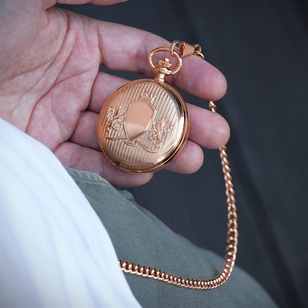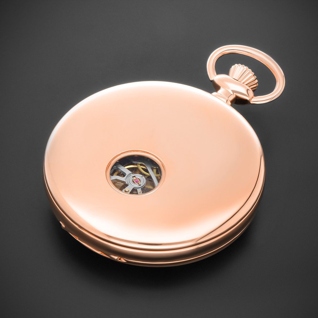 Originálně je také umístěn průzor na pracující mechanický strojek, který poodkrývá zadní strana pláště. Pánové ocení číselník s dvojitými tištěnými indexy doplněný jemnou minutovou stupnicí. Klasický vzhled kapesních hodinek doplňují klasické spade ručičky. Mechanický kalibr 2650SS (chromovaný) s frekvencí 21.600 A/h a rezervou nátahu až 30 hodin.