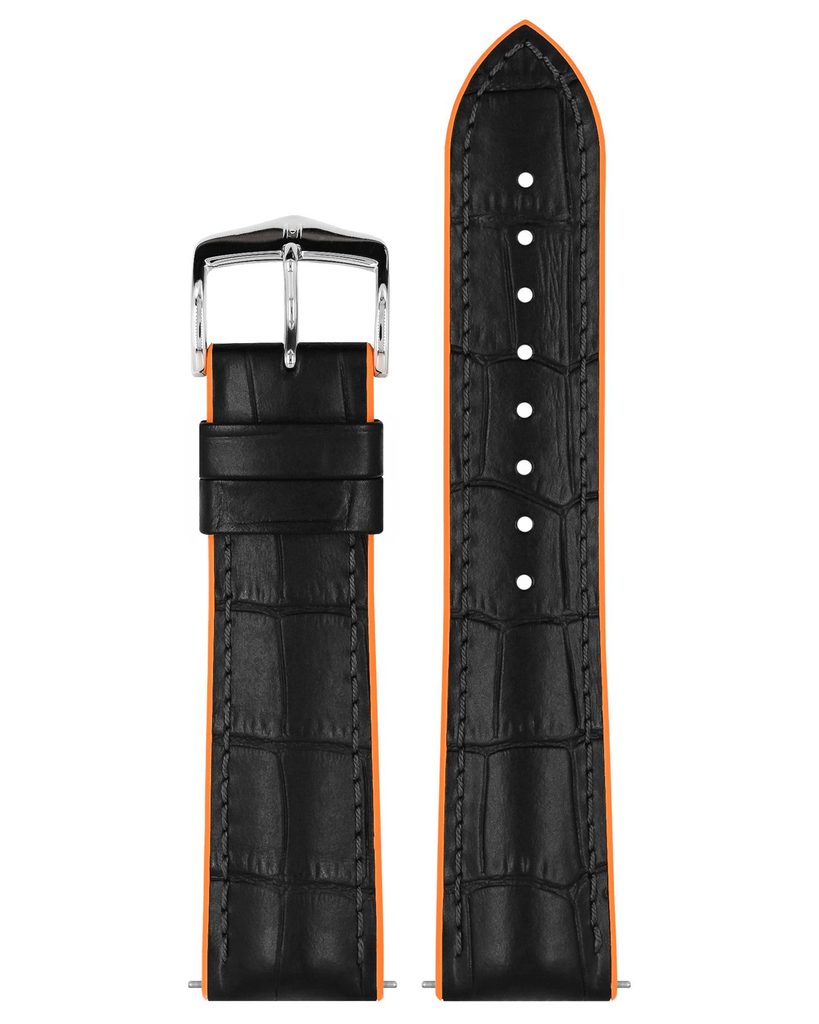 Vrchní část tvoří italská teletina s realistickým embosováním aligátora, zatímco spodní část je vybavena barevným pryžovým jádrem Hirsch Premium Caoutchouc, které poskytuje patřičný komfort a zároveň podtrhuje sportovní design. Nedílnou součástí je také kvalitní nerezová přezka.