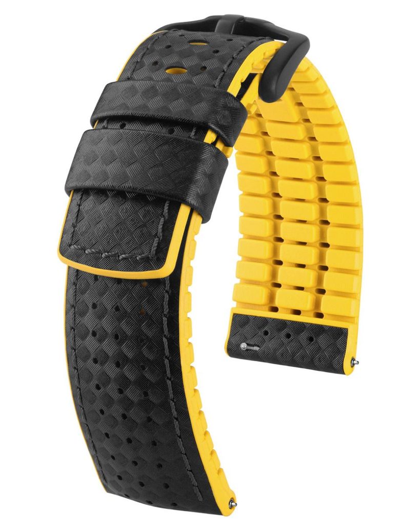 Zatímco vrchní část řemínku je vyrobena z odolné italské teletiny, spodní část je vybavena barevným pryžovým jádrem Hirsch Premium Caoutchouc, které poskytuje patřičný komfort a zároveň podtrhuje sportovní design. Nedílnou součástí je také kvalitní nerezová přezka s černým povrchem.