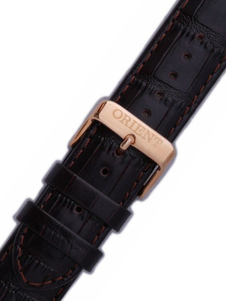 Originální kožený řemínek Orient o šířce 21 mm se může pochlubit praktickou přezkovou sponou v barvě růžového zlata a stylovým designem. Jeho kvalitní zpracování a unikátní vzhled navíc přidá hodinkám nádech elegance.