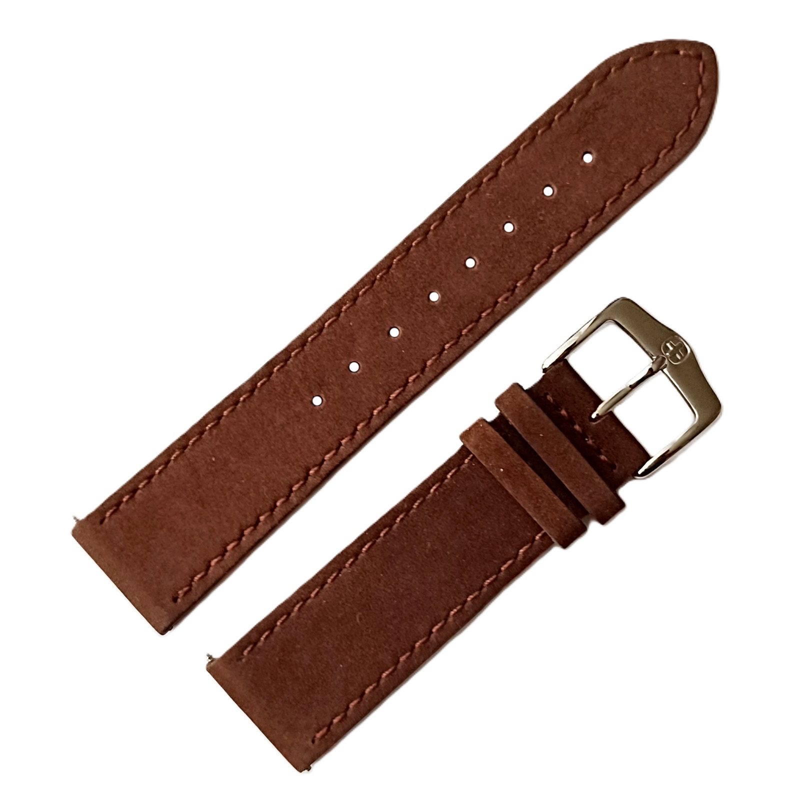 Originální Wenger řemínek v šířce 22 mm z kůže v hnědé barvě s konstrastním světlým prošítím a se stříbrnou sponou.
