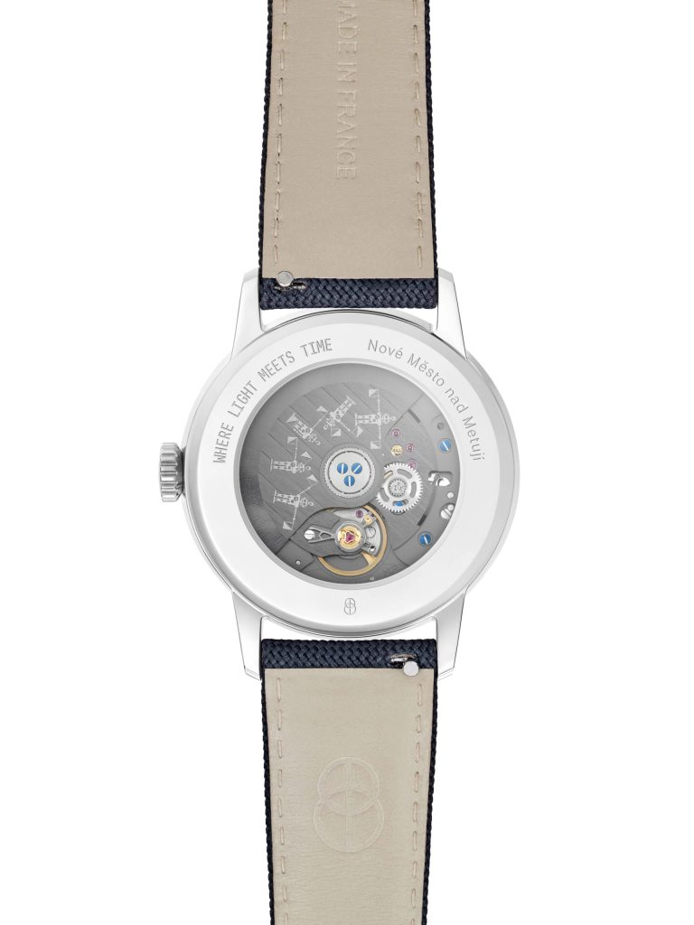 Ocelové pouzdro hodinek je doplněno tmavě šedým textilním řemínkem podšitým kůží, zakončeným trnovou sponou. Řemínek je vybaven systémem rychloupínání a případná výměna je tak velmi snadná i bez použití nástrojů.