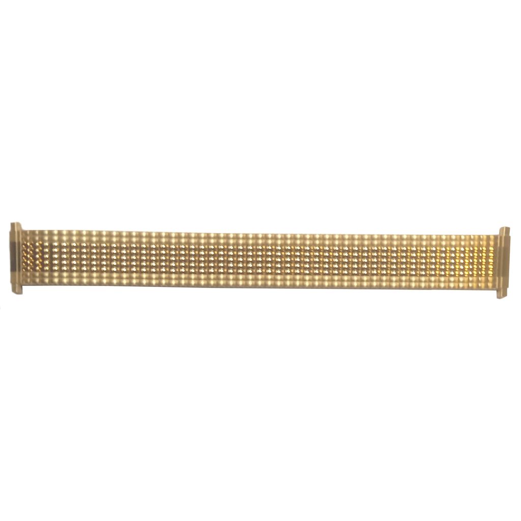Roztahovací ocelový náramek s povrchovou úpravou ve zlaté barvě. Díky pružinkám na konci lze tento náramek nasadit na hodinky s roztečí nožek 17 - 22 mm.