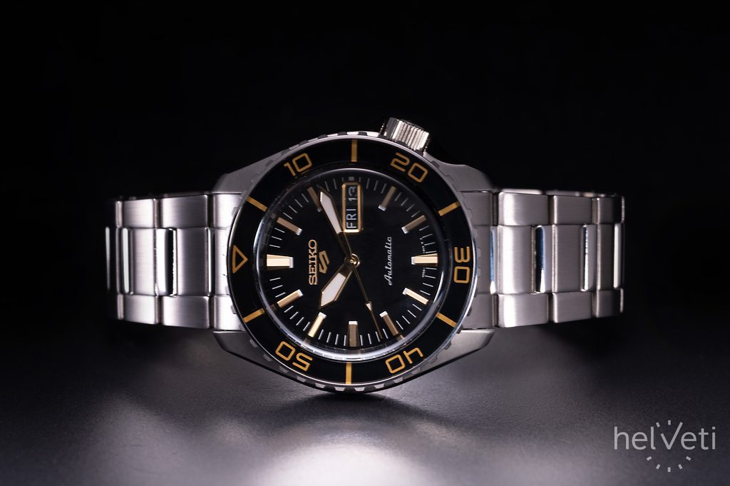 Černý číselník s kontrastními zlatými indexy a ručkami nabízí vyobrazení dne a data na pozici třetí hodiny, podobně jako předloha. Číselník chrání tvrzené minerální sklíčko Hardlex. Ocelové pouzdro hodinek doplňuje klasický článkový náramek. Hodinky pohání mechanický strojek 4R36 s automatickým nátahem a rezervou chodu kolem 41 hodin. Samozřejmostí je funkce zastavení vteřinové ručky při nařizování času a možnost nátahu korunkou. Strojek je možné pozorovat průhledným dýnkem.