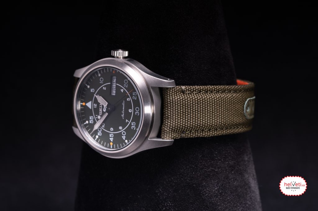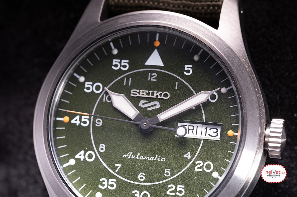 Výbornou přehledností vynikající hodinky Seiko SRPH29K1 vychází z oblíbené řady Seiko 5 Sports a zachovávají 4 z 5 detailů, které jsou pro tuto řadu typické. Mechanický strojek s automatickým nátahem, voděodolnost, pouzdro se zvýšenou odolností proti nárazům a zobrazení data a dne v týdnu v jednom okně oceníte při denním nošení i během sportování. Korunka sice není charakteristicky skrytá na úrovni 4. hodiny, ale díky její velikosti nijak nepřekáží a pohodlně se s ní manipuluje. Ocelové pouzdro hodinek doplňuje zelený textilní řemínek.
