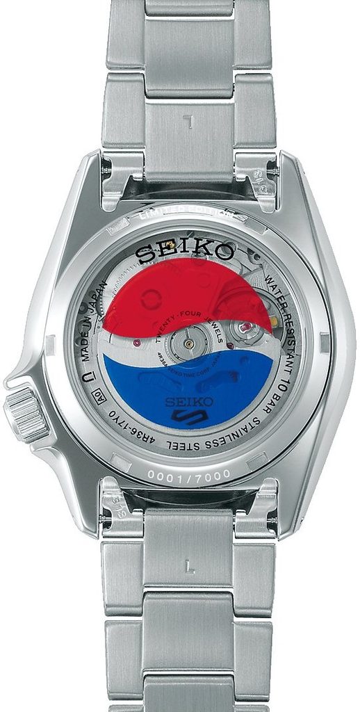 Tento nový, exkluzivní model SKX v limitované edici má retro sportovní design s logem PEPSI ve stylu oldschool z 90. let s červenomodrou lunetou na stříbrnobílém číselníku - barevné kombinace oblíbená u fanoušků hodinek Seiko. Hodinky o průměru 38 mm mají logo PEPSI nad 6. hodinou a najdeme ho také průhledném dýnku. Hodinky jsou dodávány ve speciální kovové krabičce, která je navržena jako PEPSI plechovka z 90. let.