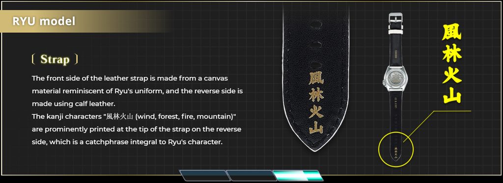 Model Seiko SRPF19K1 je kompletně stvořený podle vybraného hrdiny - podoba hodinek odráží charakter bojovníka Ryu - šrámy na lunetě znázorňují tvrdý výcvik, který Ryu podstupuje, aby se stal skutečným bojovníkem. Podoba číselníku se inspirovala tradičního japonským oděvem dō-gi používaným v judu. Znaky v kandži na pozici 9. hodiny jsou fanouškům známy z rukavic bojovníka a znamenají „Rychlý jako vítr, mírný jako les, prudký jako oheň a neotřesitelný jako hora“. Rubová strana řemínku je zdobena znaky kandži: „Vítr, les, oheň a hora“. Světlý číselník, s vyobrazením dne a data na pozici třetí hodiny, chrání tvrzené minerální sklíčko Hardlex. Ocelové pouzdro hodinek je opatřeno černou PVD úpravou povrchu, doplňuje jej modrý řemínek, kombinující kůži a textil. Hodinky pohání mechanický strojek 4R36 s automatickým nátahem a rezervou chodu kolem 41 hodin. Samozřejmostí je funkce zastavení vteřinové ručky při nařizování času a možnost nátahu korunkou. Strojek je možné pozorovat průhledným, speciálně značeným dýnkem. Předností hodinek je skvělá přehlednost daná použitím výrazných indexů a ruček. Vodotěsnost tohoto modelu je 100 m, s hodinkami tak můžete bez problémů plavat. Díky průměru pouzdra 42,5 mm jsou řazeny mezi středně velké hodinky, vhodné pro většinu pánských zápěstí.