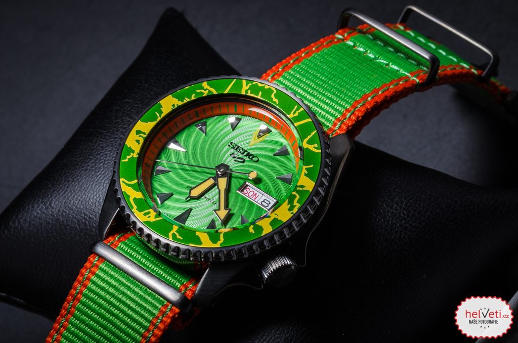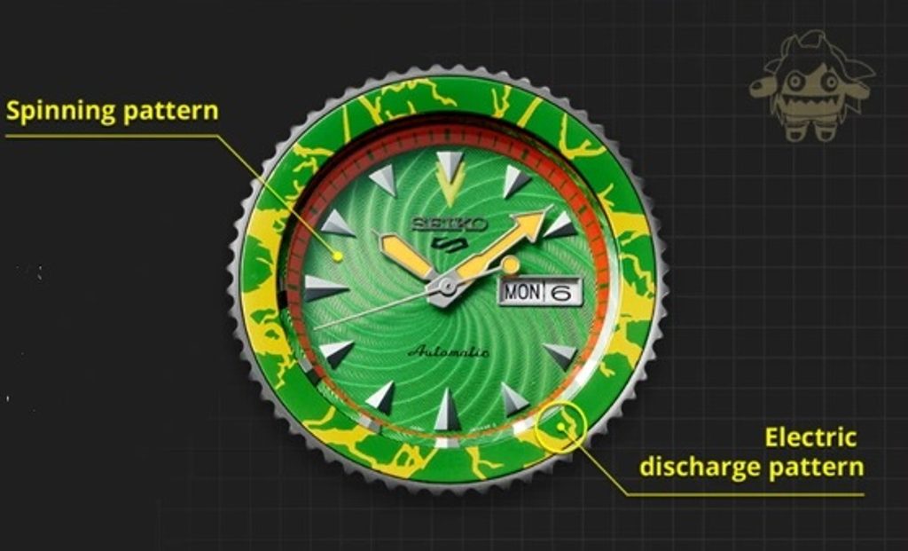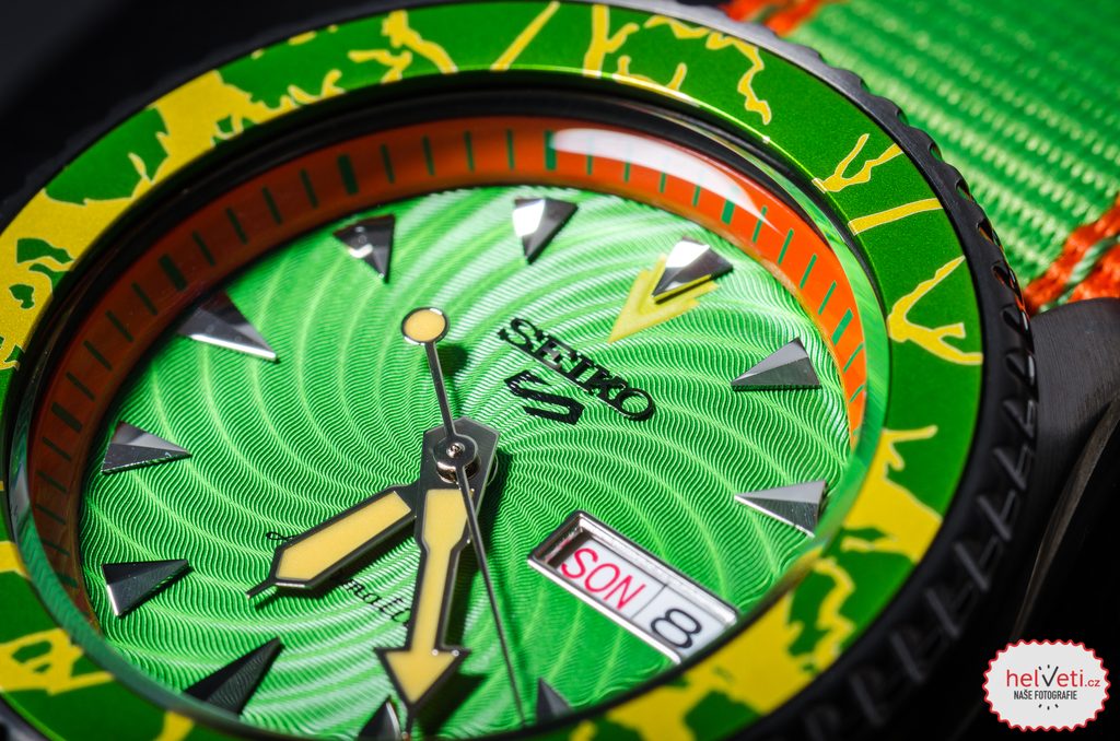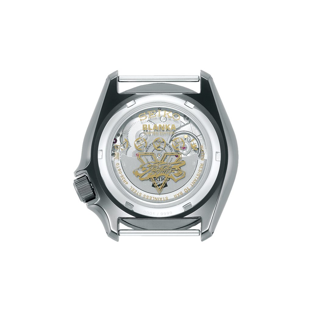 Model Seiko SRPF23K1 je kompletně stvořený podle vybraného hrdiny - podoba číselníku odráží dovednosti bojovníka Blanka, vzor na lunetě odkazuje na jeho bojovou specialitu - elektrický výboj Electric Thunder. V indexech každý fanoušek ihned pozná ostré zuby hrdiny, stejně jako ve vzoru číselníku další typickou bojovou techniku. Zelený číselník, s vyobrazením dne a data na pozici třetí hodiny, chrání tvrzené minerální sklíčko Hardlex. Ocelové pouzdro hodinek je opatřeno speciální PVD úpravou povrchu v šedé barvě, doplňuje jej textilní nato řemínek. Hodinky pohání mechanický strojek 4R36 s automatickým nátahem a rezervou chodu kolem 41 hodin. Samozřejmostí je funkce zastavení vteřinové ručky při nařizování času a možnost nátahu korunkou. Strojek je možné pozorovat průhledným, speciálně značeným dýnkem. Předností hodinek je skvělá přehlednost daná použitím výrazných indexů a ruček. Vodotěsnost tohoto modelu je 100 m, s hodinkami tak můžete bez problémů plavat. Díky průměru pouzdra 42,5 mm jsou řazeny mezi středně velké hodinky, vhodné pro většinu pánských zápěstí.