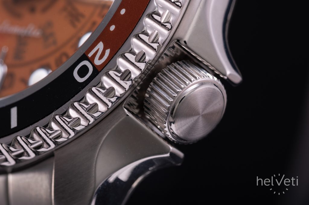 Průhledný číselník s vyobrazením dne a data na pozici třetí hodiny chrání tvrzené minerální sklíčko Hardlex. Ocelové pouzdro hodinek doplňuje klasický článkový náramek. Hodinky pohání mechanický strojek 4R36 s automatickým nátahem a rezervou chodu kolem 41 hodin. Samozřejmostí je funkce zastavení vteřinové ručky při nařizování času a možnost nátahu korunkou. Strojek je možné pozorovat průhledným, speciálně značeným dýnkem. Předností hodinek je rozhodně jejich nevšední retro vzhled. Vodotěsnost tohoto modelu je 100 m, s hodinkami tak můžete bez problémů plavat. Díky průměru pouzdra 42,5 mm jsou řazeny mezi středně velké hodinky, vhodné pro většinu pánských zápěstí.