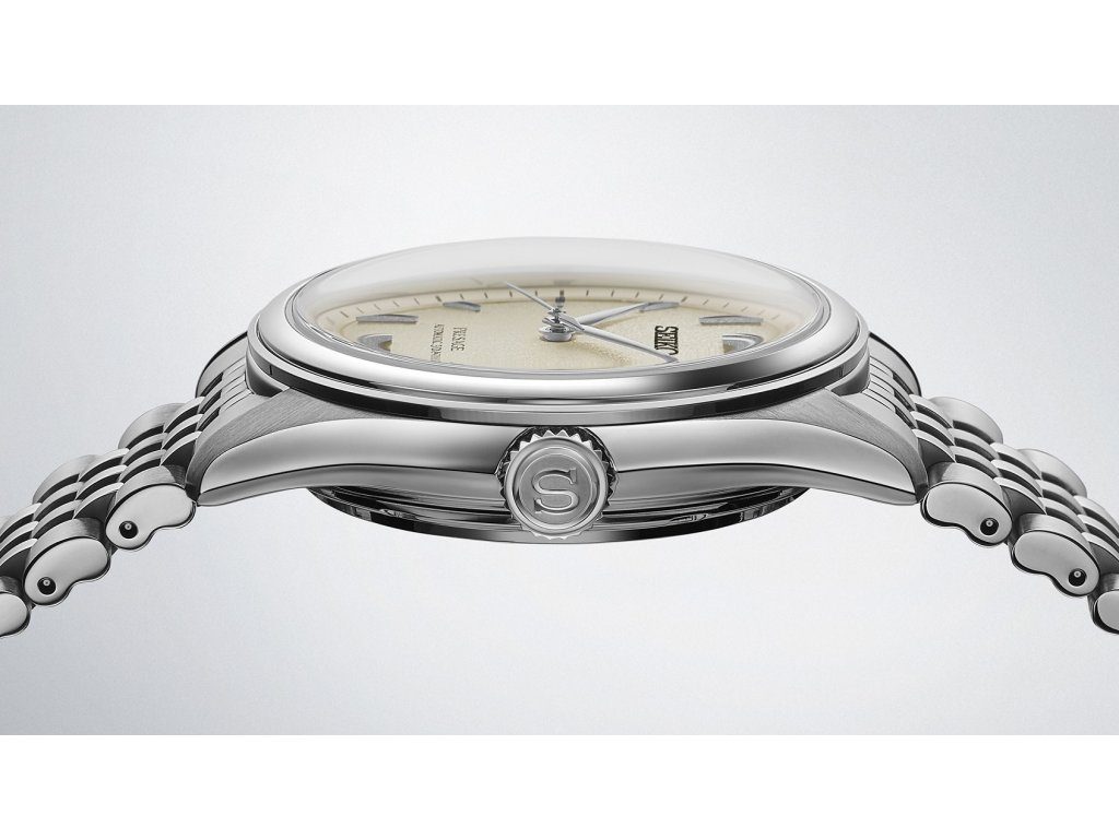 Ocelové pouzdro hodinek Seiko SPB463J1 doplňuje sedmiřadý ocelový náramek z jemných dílků, dodávající hodinkám celkově velmi elegantní vzhled a umocňující jejich univerzálnost. Pouzdro i náramek nesou povrchovou úpravu super hard coating, která zvyšuje odolnost proti poškrábání. Texturovaný číselník krémové barvy doplňují jemné stříbrné alfa ručky a plastické indexy na pozicích hodin. Číselník je chráněn klenutým safírovým sklíčkem s vnitřním antireflexem a vysokou odolností vůči poškrábání. Pro udržení čistoty číselníku a klasického vzezření jsou hodinky vybaveny pouze funkcí zobrazení data na pozici třetí hodiny. Srdcem hodinek je mechanický strojek s automatickým nátahem 6R55, s rezervou chodu až 72 hodin a frekvencí 21,600 polokmitů za hodinu. Voděodolnost tohoto modelu je 100 m, s hodinkami je možné plavat. Průměr pouzdra je příjemných 40,2 mm.