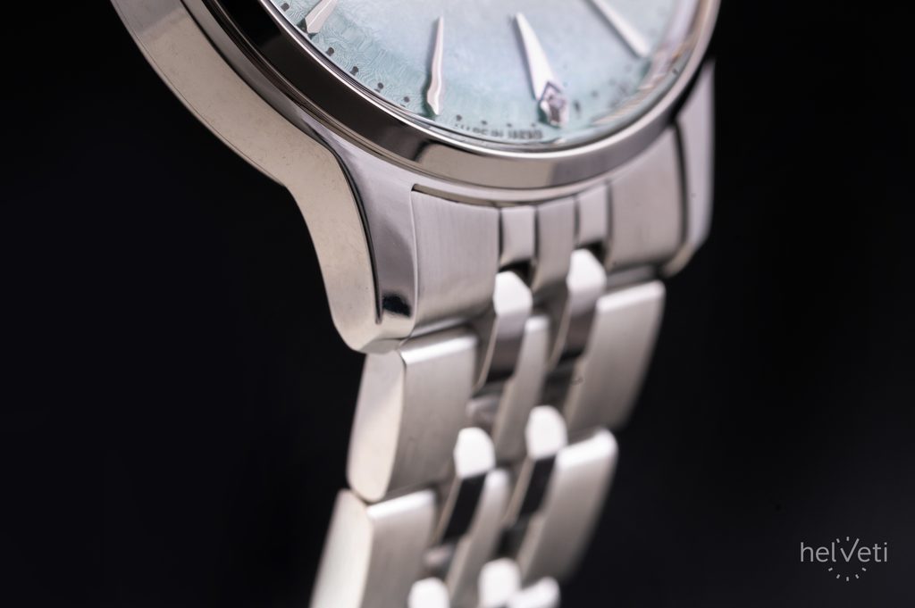 Světle zelený číselník modelu Seiko SRPL63J1 je opatřený novou strukturou, evokující drcený led ve sklenici s koktejlem, novým tvarem jehlových aplikovaných indexů, doplněných na 4 pozicích jiskřivými diamanty a Dauphine ručkami. Nechybí ani zlatá vteřinová ručka coby míchátko koktejlu. Číselník chrání klenuté sklíčko Hardlex, zintenzivňující hru světla na strukturovaném povrchu.