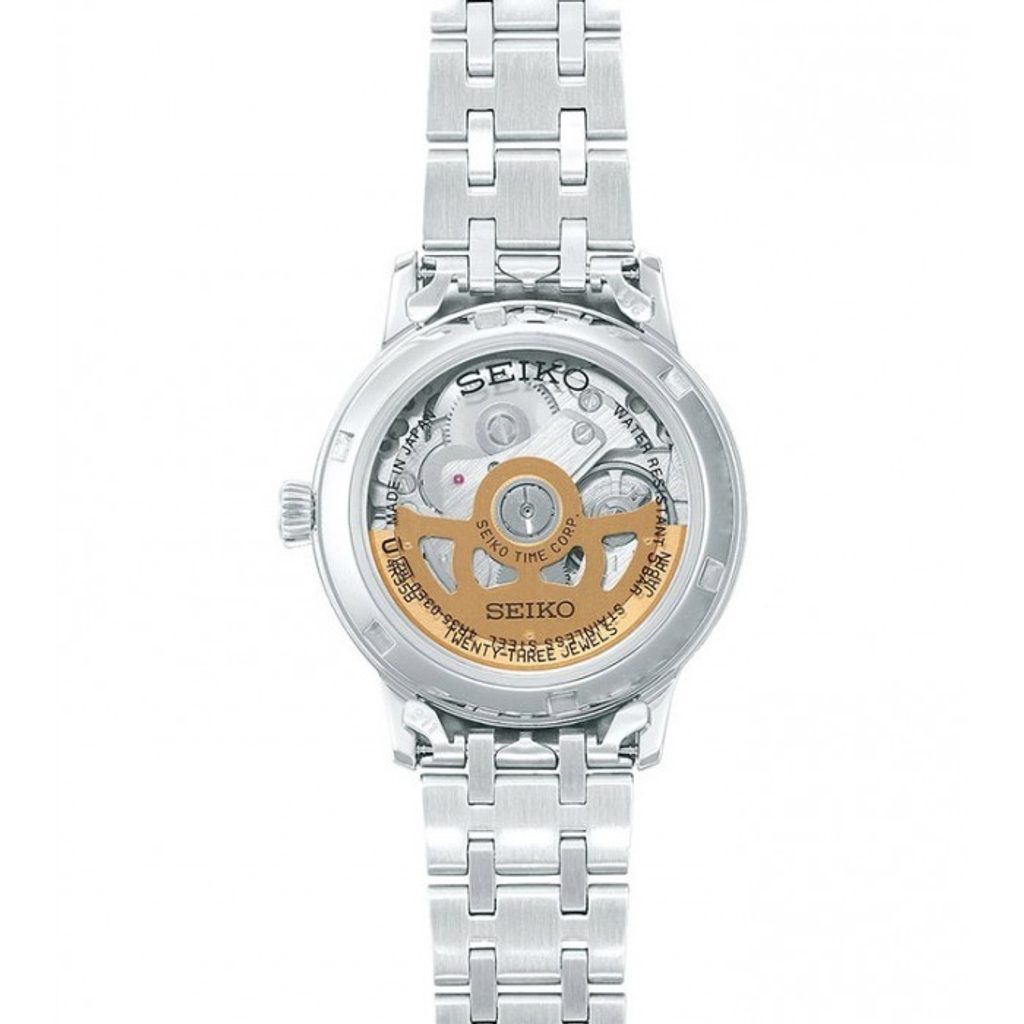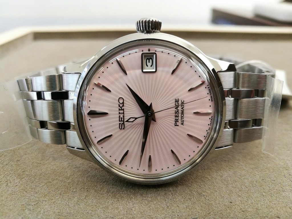 Model Seiko SRP839J1 má růžový číselník opatřený typickou strukturou a plastickými indexy stříbrné barvy na pozicích hodin. Pohání jej automatický kalibr 4R35, který má 23 kamenů a rezervu chodu až 41 hodin. Práci automatického strojku můžete sledovat průhledným dýnkem hodinek. Číselník chrání klenuté sklíčko Hardlex (tvrzený minerál), zintenzivňující hru světla na strukturovaném povrchu. Ocelové pouzdro hodinek je doplněno ocelovým náramkem dodávajícím hodinkám celkově velmi elegantní vzhled. Vodotěsnost tohoto modelu je 50 m. Nechybí ani ukazatel data na pozici 3. hodiny. Průměr pouzdra činí pro dámská zápěstí ideálních 33,8 mm.