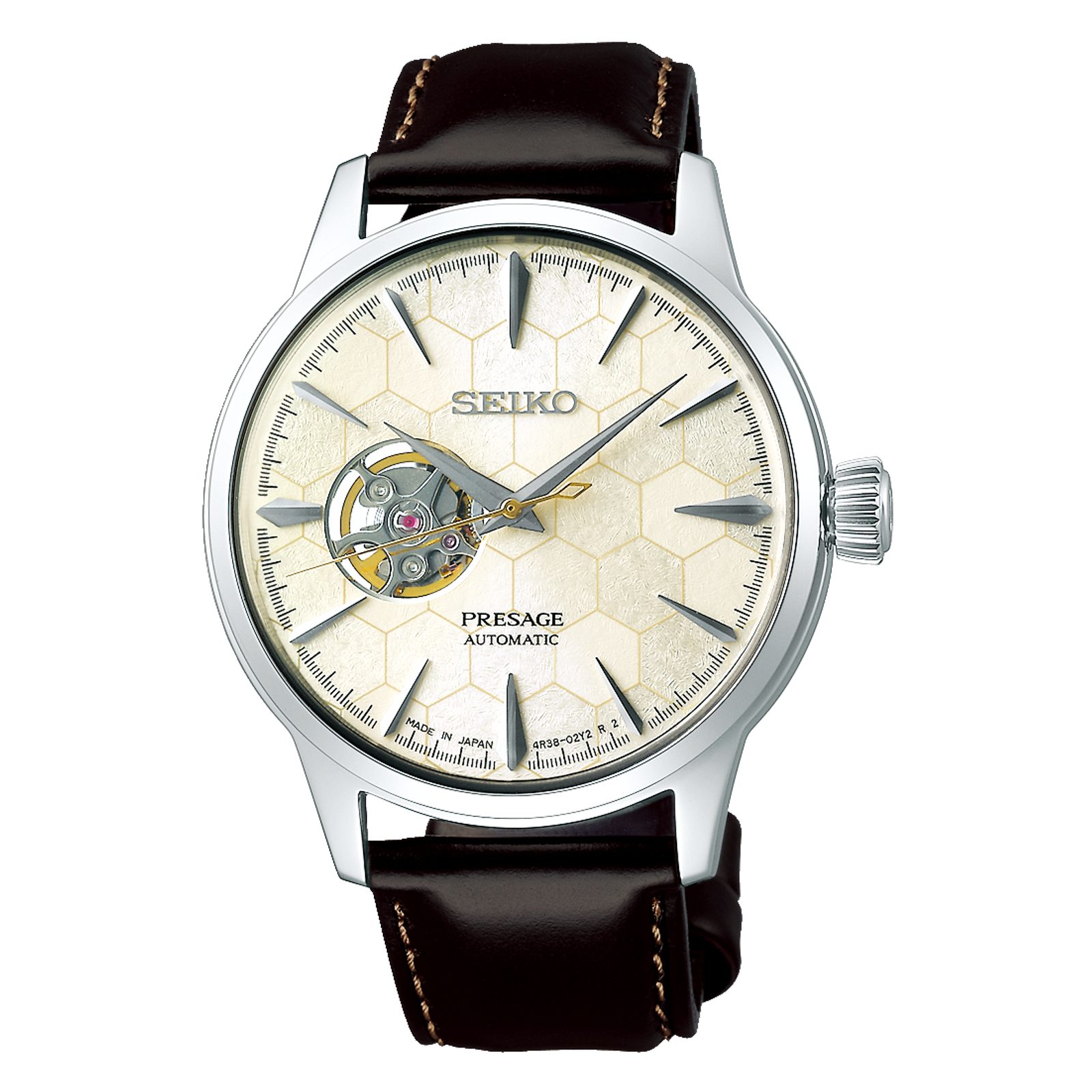 Model Seiko SSA409J1 má číselník v barvě šampaň s jemnou kresbou plástve, jejíž nekterá okénka vyplňuje struktura připomínající vlákna, či ledovou tříšť v tekutině. Pozice hodin jsou opatřeny aplikací plastických indexů. Hodinky pohání automatický strojek 4R38, který má 24 kamenů a rezervu chodu až 41 hodin. Precizní práci automatického strojku můžete sledovat nejen průhledným dýnkem, ale také průhledem na setrvačku v číselníku na pozici 9. hodiny. Číselník chrání klenuté sklíčko Hardlex, zintenzivňující hru světla na strukturovaném povrchu. Ocelové pouzdro hodinek je doplněno kvalitním hladkým koženým řemínkem, dodávajícím hodinkám velmi elegantní vzhled. Vodotěsnost tohoto modelu je 50 m. Průměr pouzdra činí ideálních 40,5 mm. Hodinky jsou dodávány ve speciálním balení s koženým řemínkem s krokodýlím vzorem navíc. Snadnou výměnu řemínků zajišťuje systém uchycení pomocí rychlostěžejek.