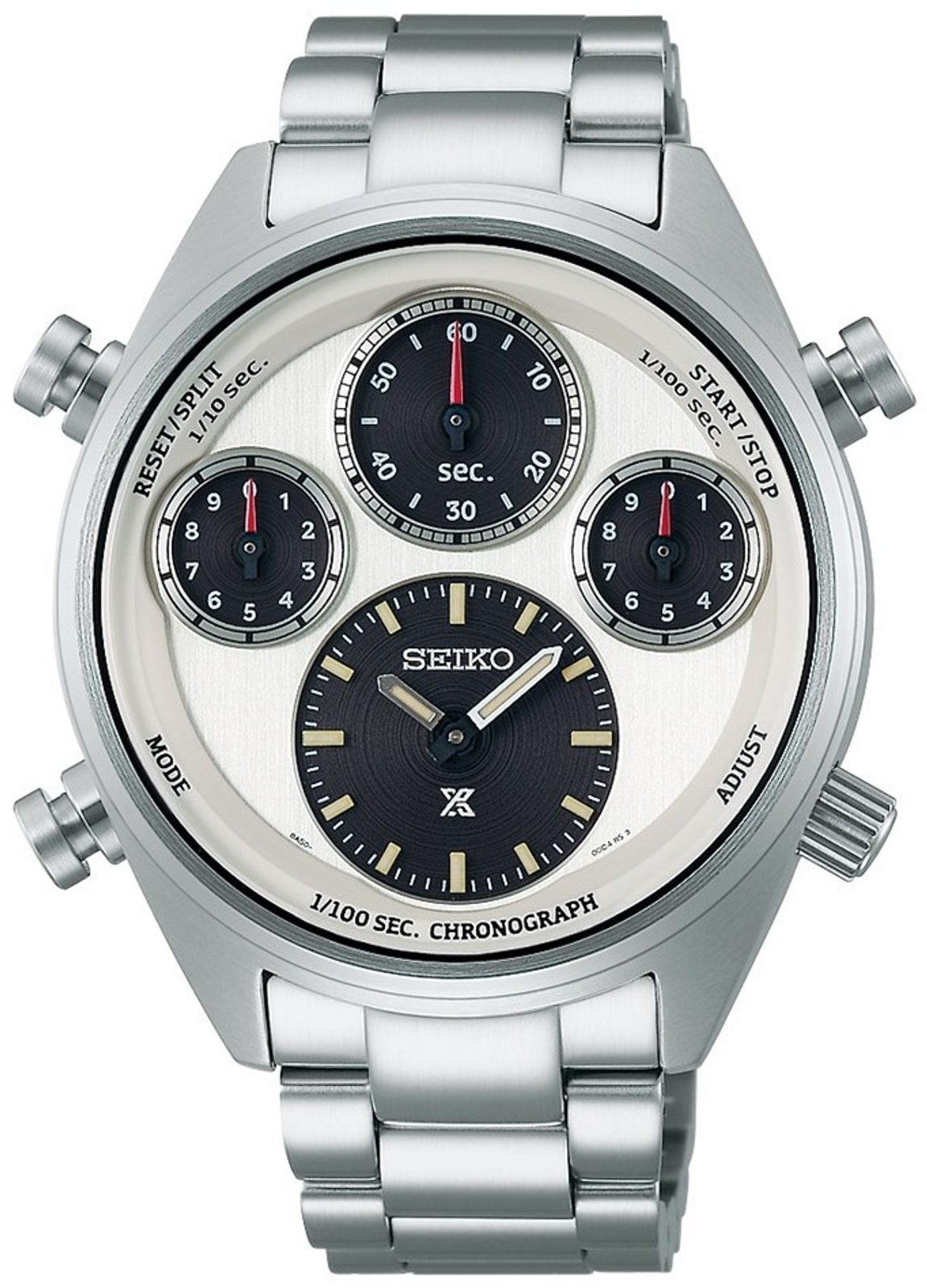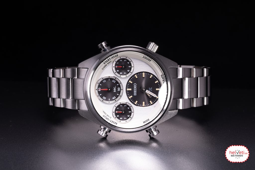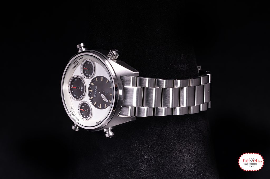 Pouzdro i náramek hodinek Seiko SFJ009P1 jsou vyrobené z nerezové oceli s broušeným povrchem, součástí balení je však také hladký kožený řemínek zakončený překlápěcí sponou. Bílý číselník s kontrastními subciferníky (tzv. panda dial) je vybaven funkcí ukazatele času a stopek. Stopky je možné ovládat postranními tlačítky - pravé vrchní stopky spouští a zastavuje, levé vrchní nuluje naměřené hodnoty, zároveň slouží pro měření mezičasů. Levé spodní tlačítko slouží k přepínání režimů. S hodinkami lze měřit až hodinové intervaly s přesností na 1/100 sekundy.