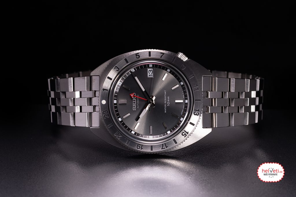Antracitový číselník, s vyobrazením data na pozici třetí hodiny, chrání vypouklé safírové sklíčko s vnitřním antireflexem. Ocelové pouzdro hodinek doplňuje nevšední náramek, který připomíná náramky ze 60. let, ale je samozřejmě vyroben moderními technologiemi a na ruce je velmi příjemný.