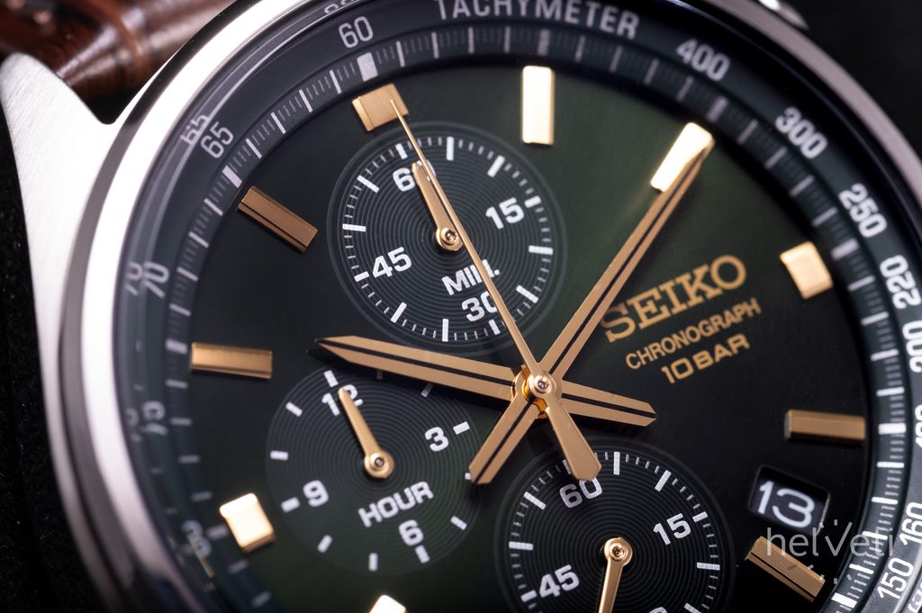 Seiko SSB385P1 jsou velice povedeným sportovním modelem z řady Seiko Quartz Chronograph. Ocelové pouzdro hodinek je doplněno hnědým koženým řemínkem s krokodýlím vzorem. Zelený číselník se zlatými akcenty je vybaven funkcí ukazatele data a stopek, jejichž chod zobrazují dva přehledné subciferníky - čítač minut na pozici dvanácté hodiny a hodin na pozici deváté hodiny. Stopky je možné ovládat postranními tlačítky - vrchní stopky spouští a zastavuje, spodní nuluje naměřené hodnoty. Číselník je chráněn tvrzeným minerálním sklíčkem Hardlex. Sportovní nádech je podpořen tachymetrickou stupnicí umístěnou po obvodu číselníku, díky níž lze, spolu za použití stopek, změřit rychlost pohybujícího se objektu. Vodotěsnost tohoto modelu je 100 m, s hodinkami se tak můžete bez obav koupat.