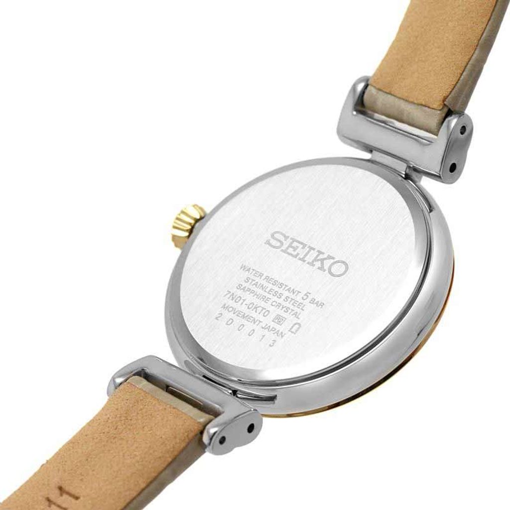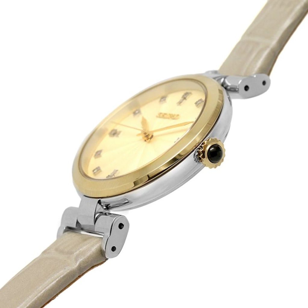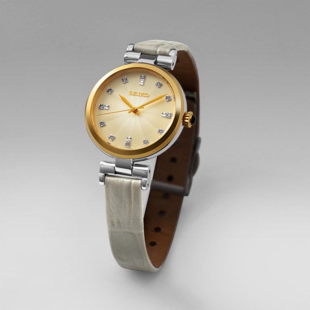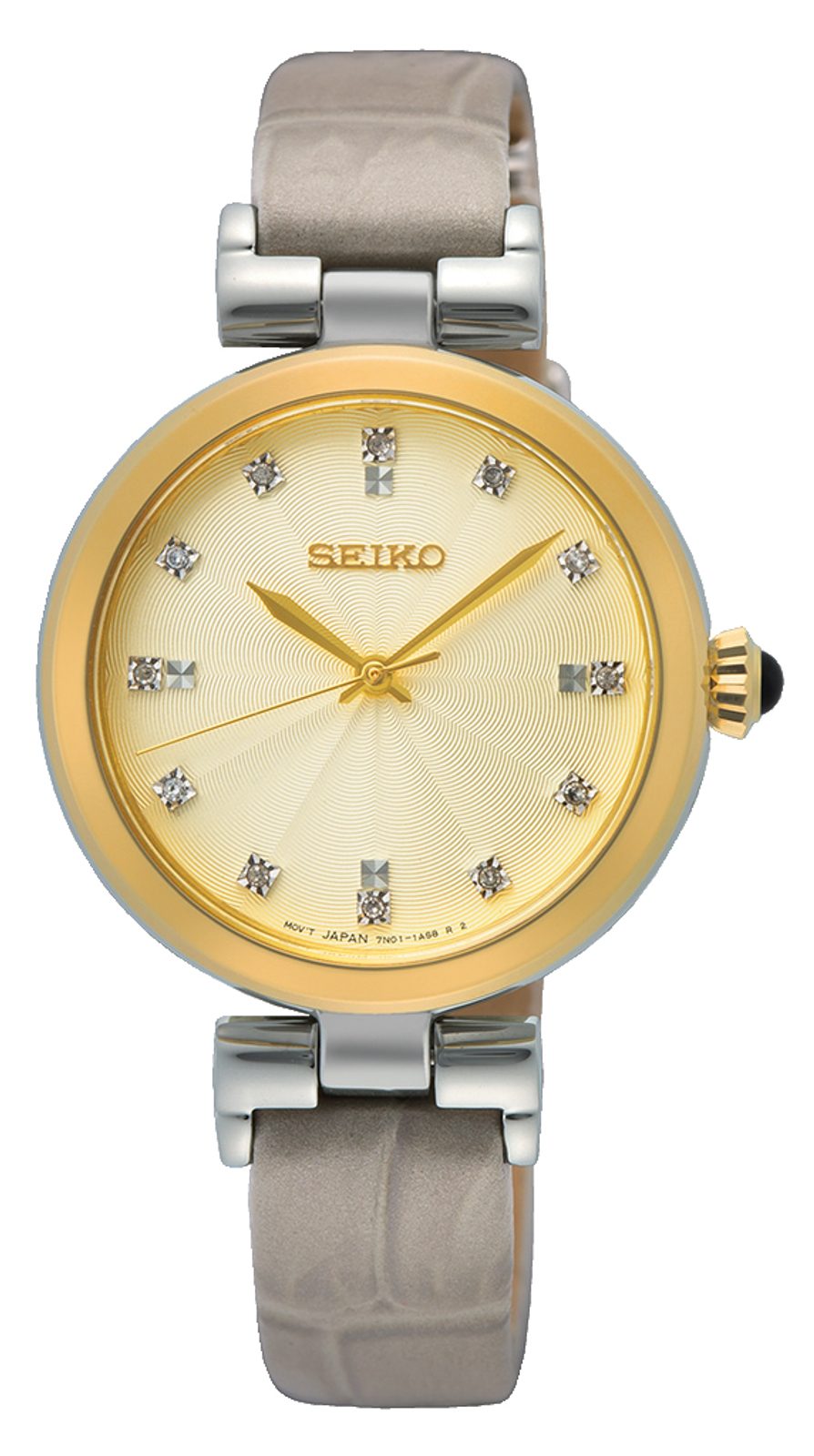 Hodinky Seiko SRZ546P1 jsou díky svému zpracování a designu vhodným doplňkem do společnosti, ale také pro každodenní nošení. Ocelové pouzdro hodinek doplňuje šedohnědý kožený řemínek, zakončený překlápěcí sponou. Zákaznicemi velice oblíbený číselník s jemnou strukturou je vhodně doplněn aplikací diamantů na pozicích hodin a použitím zlatých ruček. Chráněn je pak safírovým sklíčkem. Celkový dojem dotváří také kabošon zasazený v korunce. Hodinky pohání kvalitní quartzový strojek firmy Seiko.