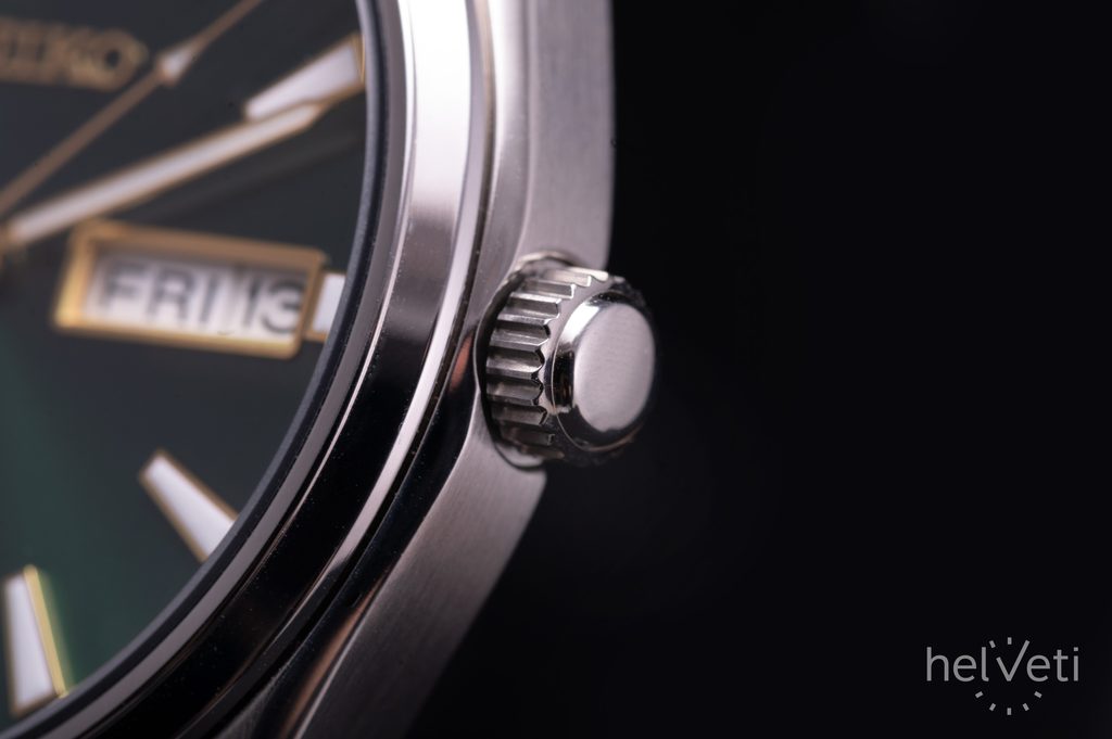 Ocelové pouzdro hodinek Seiko SUR449P1 doplňuje hnědý kožený řemínek. Zelený číselník je opatřen výraznými ručkami a indexy na pozicích hodin, chráněn je safírovým sklem, které je vysoce odolné proti poškrábání. Přehlednost hodinek je vedle vhodného designu podpořena také aplikací luminiscenční vrstvy na ručky a indexy, zajišťující tak lepší čitelnost při zhoršených světelných podmínkách. Hodinky disponují ukazatelem data a dne na pozici 3. hodiny. Vodotěsnost modelu je 100 m, hodinky tak není třeba odkládat ani při plavání.